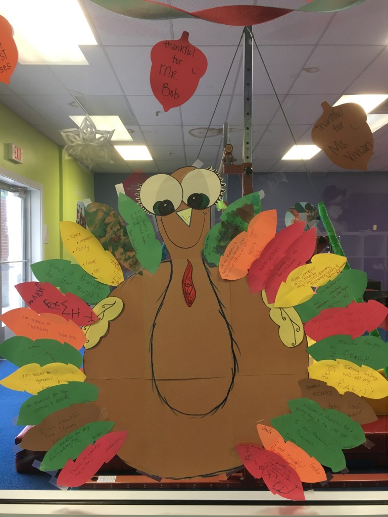 Nous n’avons pas encore fêter Thanksgiving avec des américains donc je ne peux pas vraiment en parler… Cette année nous étions partis en vacances en cette période. Hé, sujet d’un update l’année prochaine ?!? Tout ce que j’ai pu voir de Thanksgiving c’est qu’à la crèche et à la babygym (alors du coup je ne sais pas si c’est représentatif), ils proposaient un dessin de corps de dinde et chacun pouvait écrire sur une feuille représentant une plume ce pourquoi il était reconnaissant.
