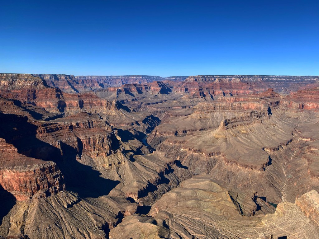 La vue depuis en haut était déjà à elle seule à couper le souffle. C’était tellement intense, j’avoue avoir versé ma larme. J’y allais, enfin, et dans des conditions dans lesquelles jamais je n’aurais cru pouvoir ! On traverse le désert, passe au dessus du barrage Hoover, et d’un coup on le voit, ça y est, et on plonge littéralement dedans pour se poser sur les rives du Colorado.