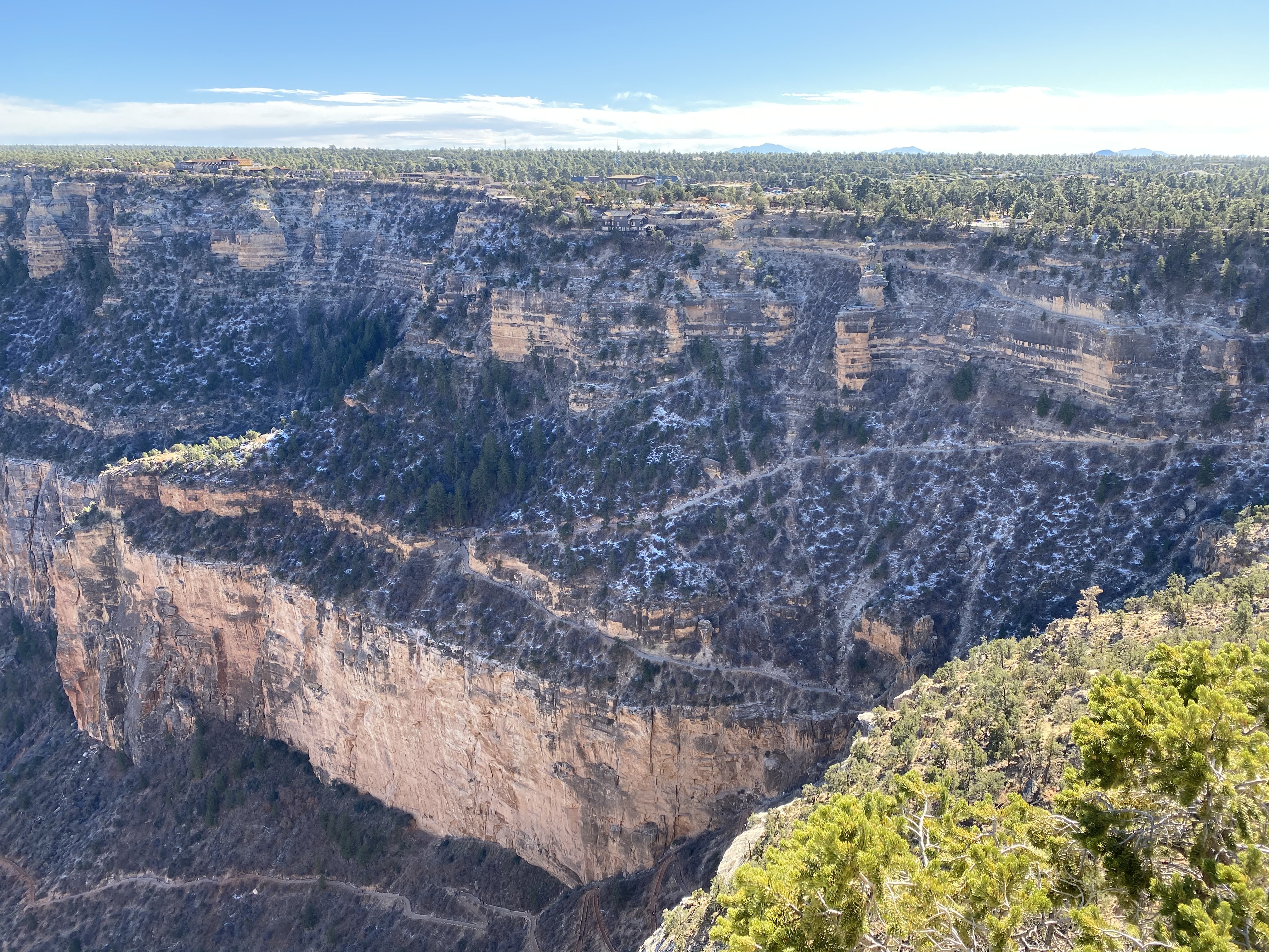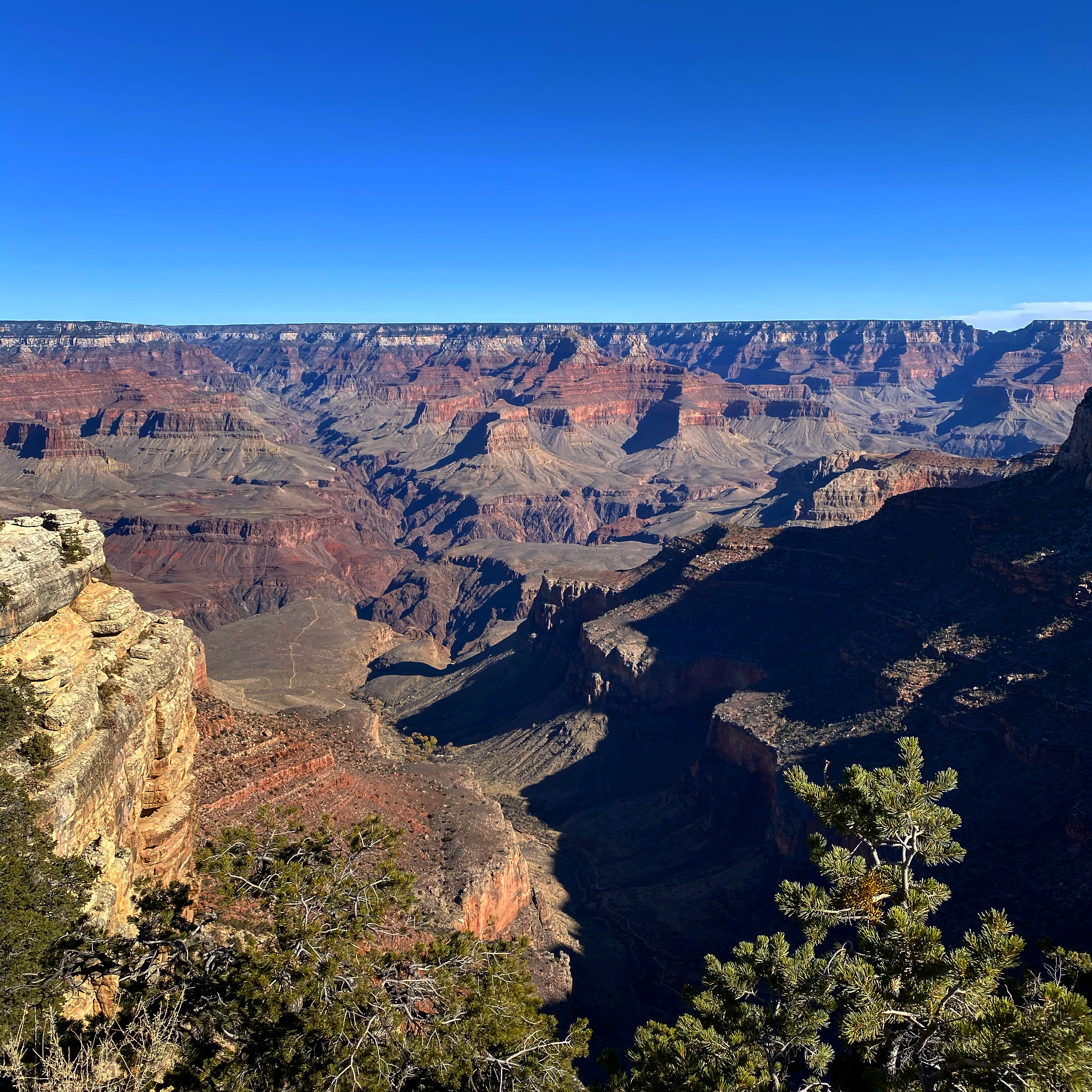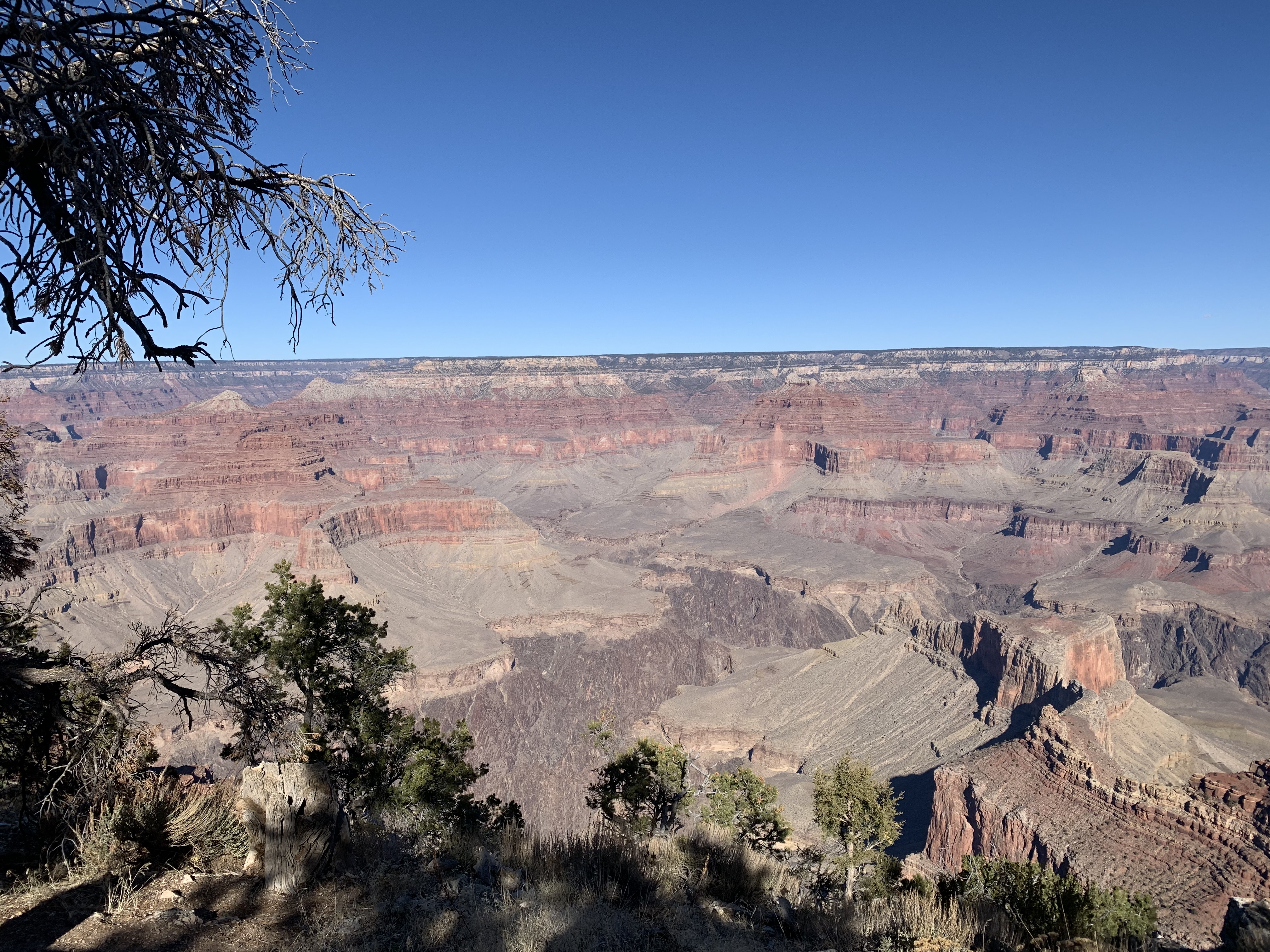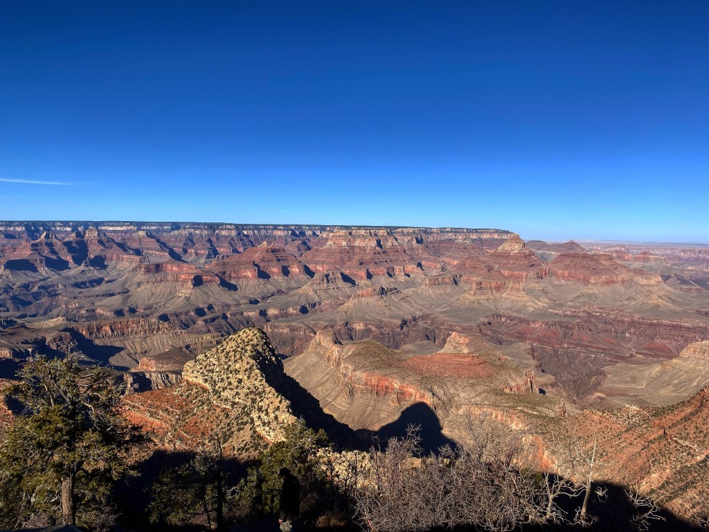 Nous nous rendons ensuite de l’autre côté du site pour faire une partie de la Desert View Drive. Je voulais en profiter pour me rendre à Yaki Point mais même hors saison, cette route n’est visiblement accessible qu’aux navettes. Changement de décor. La végétation est plutôt dense et les points de vue éloignés les uns des autres. Sachant que l’entrée du Parc côté Est, par où je voulais initialement sortir, était fermée car sur Terre de la réserve Indienne Navajo (tous leurs sites sont fermés à cause du Covid), on ne voulait pas rouler longtemps pour n’avoir que quelques points de vue et faire demi-tour. On avait déjà bien profité avec la Hermit Road. On ne s’arrêtera donc qu’au Grandview Point. Sublime ! Encore une fois presque l’impression d’un autre paysage, de nouvelles couleurs et cette sensation de voir au-delà du Canyon, comme si on en voyait la fin.