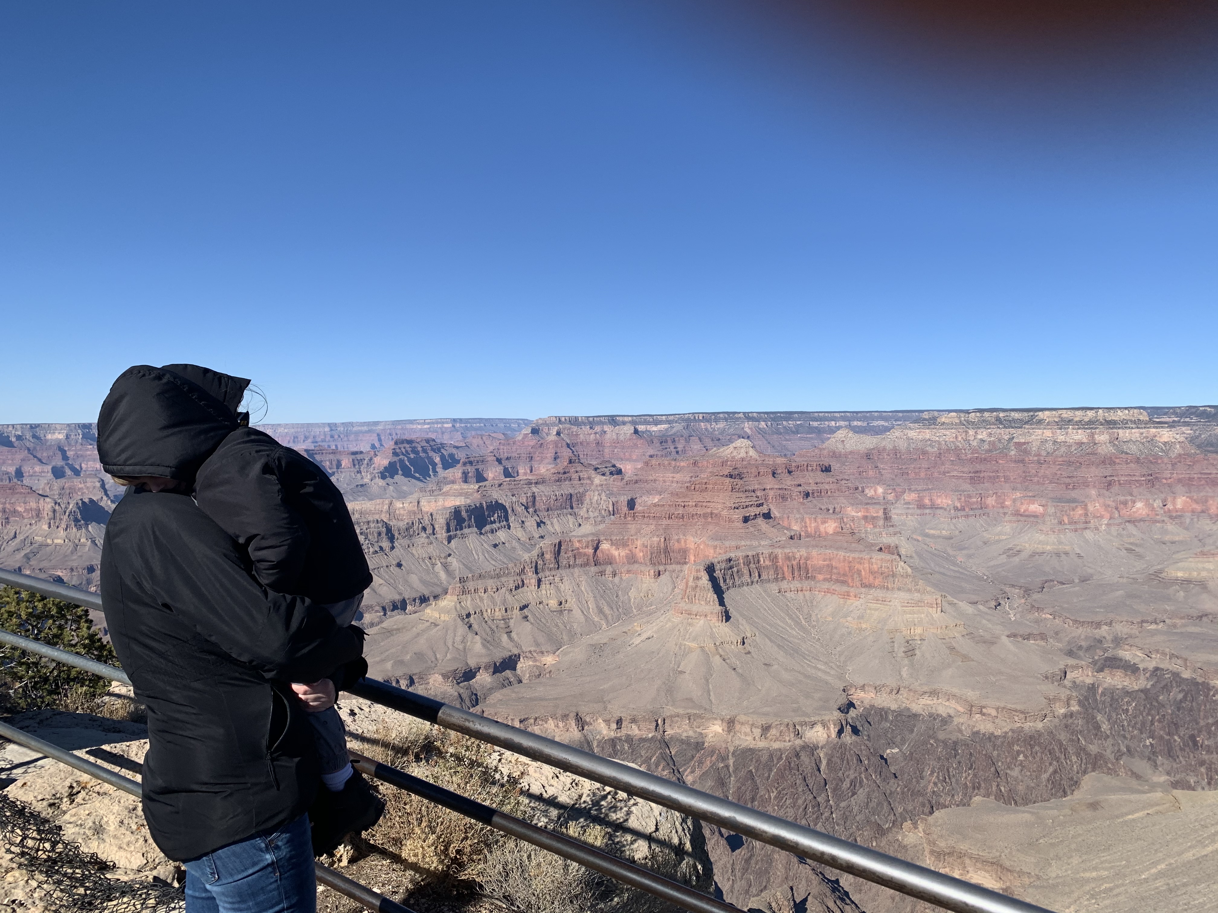 Nous avons donc dû sortir de la voiture chacun notre tour pour ne pas le laisser seul, il n’a que 3 ans, quand même !! Nous avons fait tous les spots. Bright Angel trailhead est le premier de la route. Pas le plus beau. Mais le plus intense. Car c’est le premier où on s’arrête et donc le premier où de nouveau, comme 10 ans auparavant, l’émotion nous transporte. Comme je le disais, la surprise de la découverte n’est plus là, mais la magie, si. Mes points de vue favoris ont été Maricopa, Mohave, et Pima Point. Et celui que j’ai le moins aimé, The Abyss. C’est tout à fait personnel mais la vue n’est pas panoramique donc bien que ça tombe à pic, c’est relativement moins impressionnant à mon goût. Le site est somptueux en vrai, mais en photo, ca ne rend pas vraiment, et ça peut sembler plus ou moins toujours la même chose, donc je ne met que quelques photos mélangés de tous les points de vue. Vous remarquerez une nette amélioration de la qualité des photos par rapport à notre premier visite mais aussi la presque seule présence du paysage. Visiblement, quand on vieillit, on apprécie moins être devant l’objectif 🤣