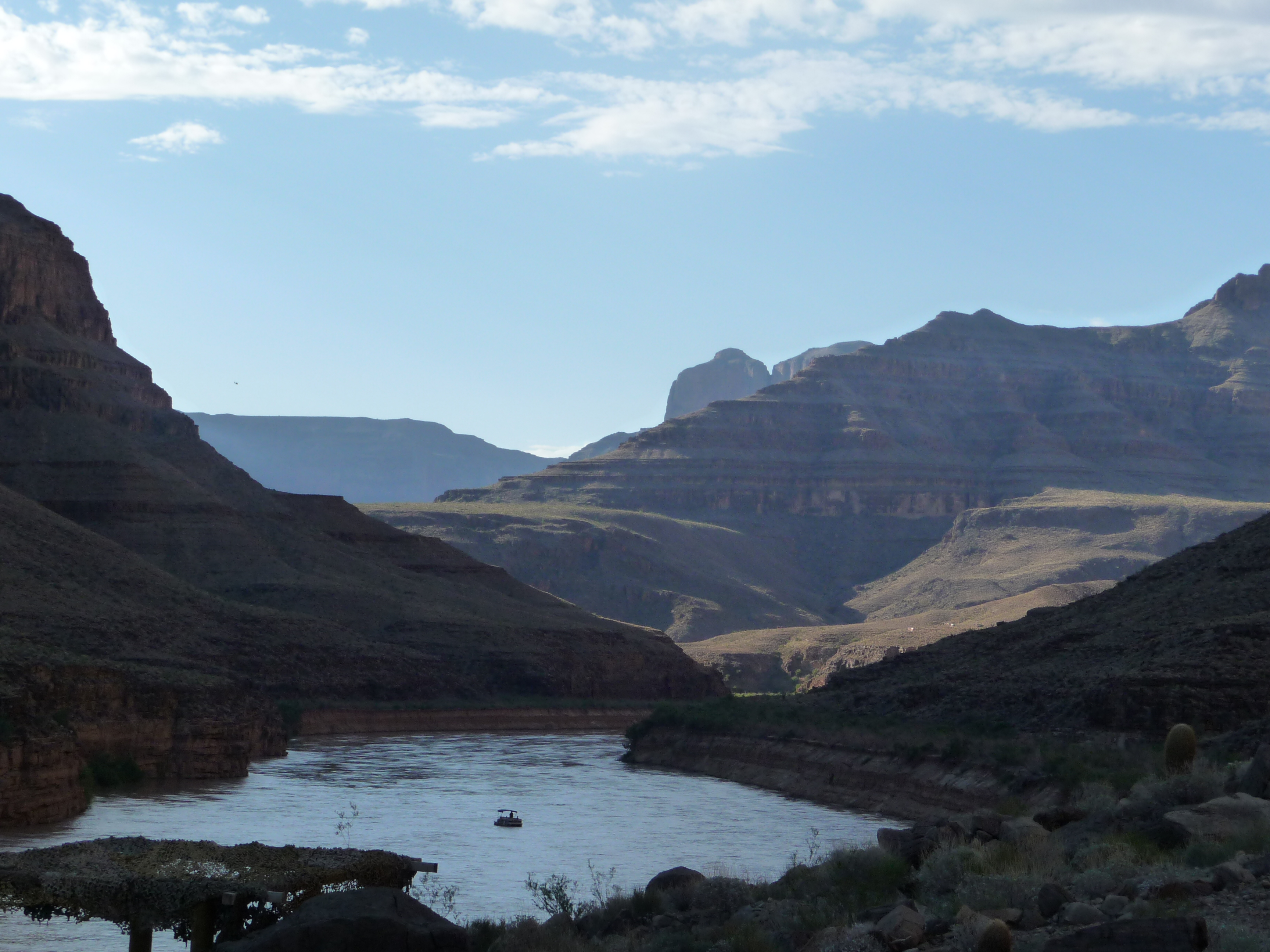On descend et on embarque dans un bateau pour un (très très très) rapide tour sur le fleuve Colorado puis retour dans l’hélico pour nous emmener en haut du Canyon. Nous étions 3 couples, plus le pilote. Chaque couple a pu aller devant. Je ne sais pas si c’est parce que nous étions de loin les plus jeunes mais nous avons eu la place devant sur le trajet en bas/en haut du Canyon soit un temps ridiculement court comparé à Las Vegas/Grand Canyon aller et Grand Canyon/Las Vegas retour. C’était un peu frustrant et je pense que si c’était à refaire et maintenant que je connais mieux le US j’oserais volontiers déposer un billet au pilote en guise de pourboire mais AVANT de partir pour être sûre d’avoir ma place sur un long trajet 😉
