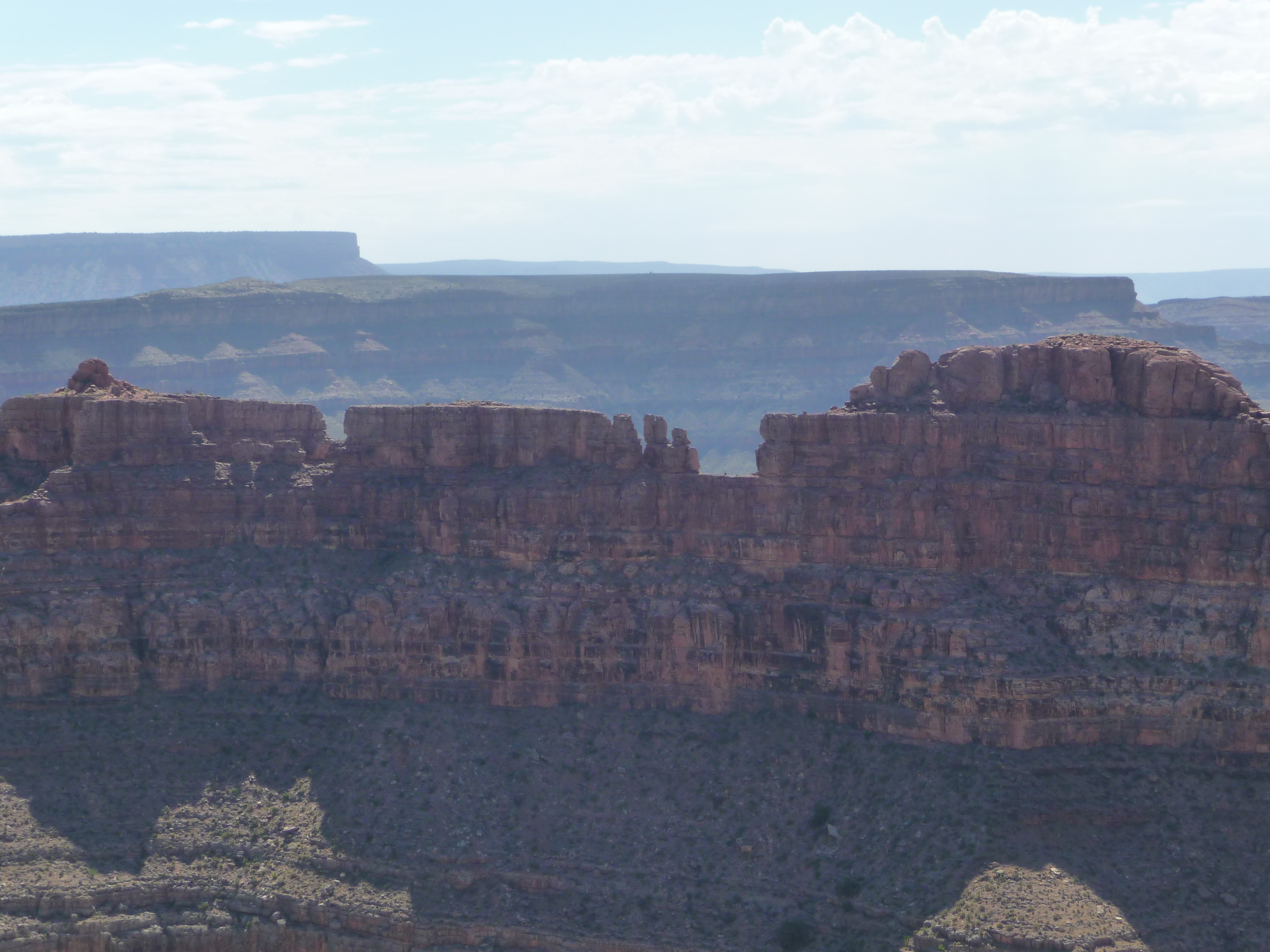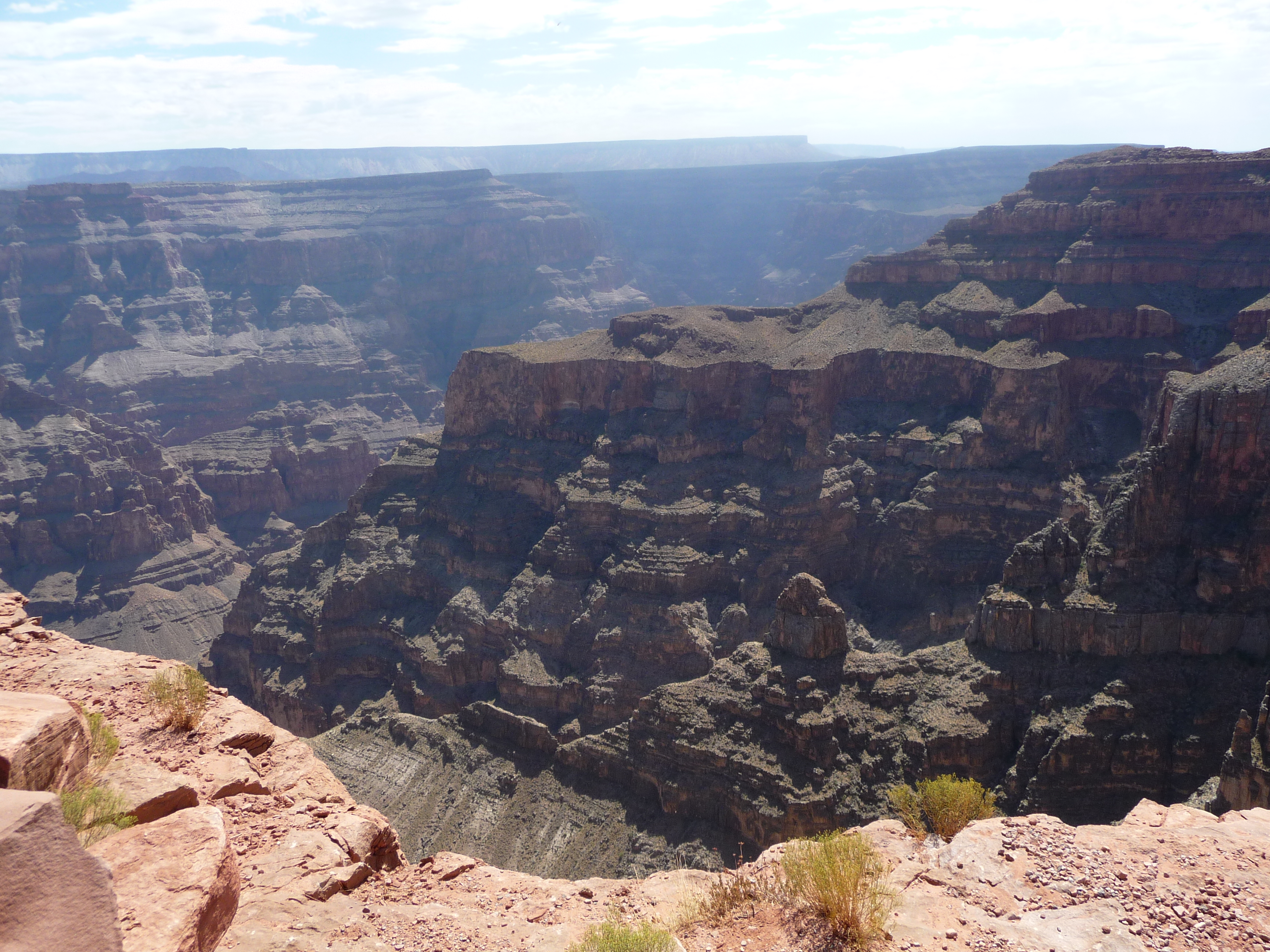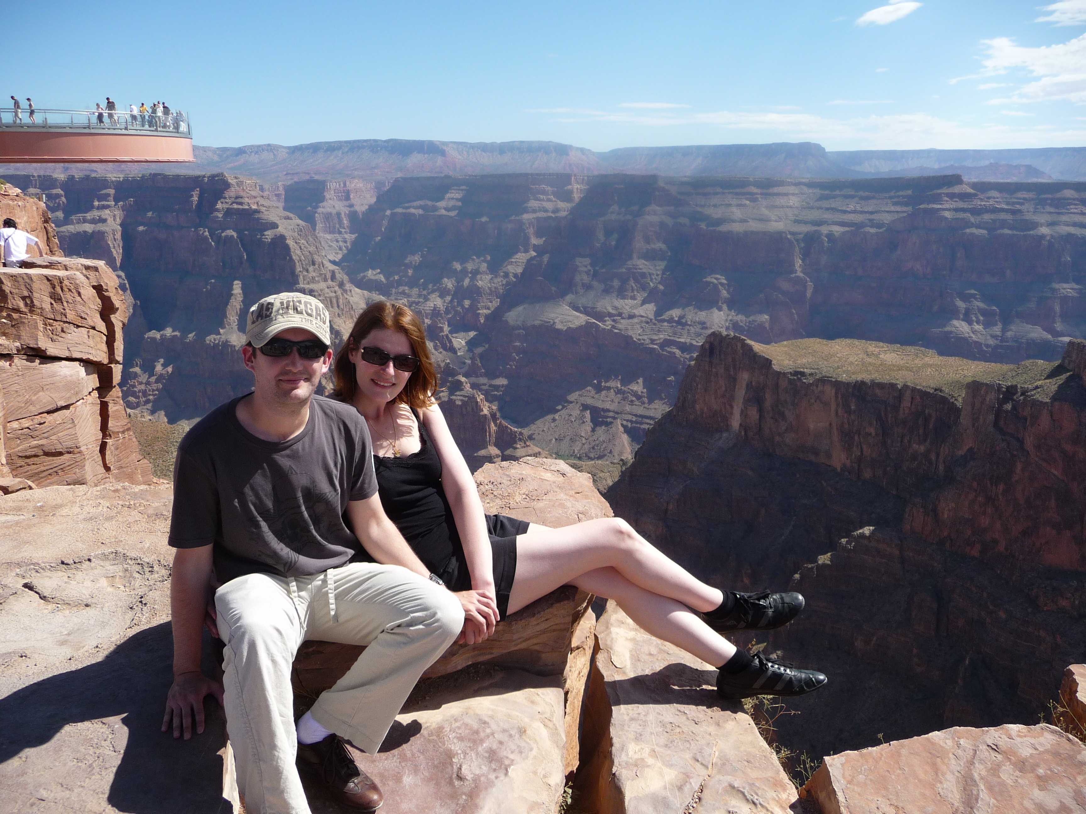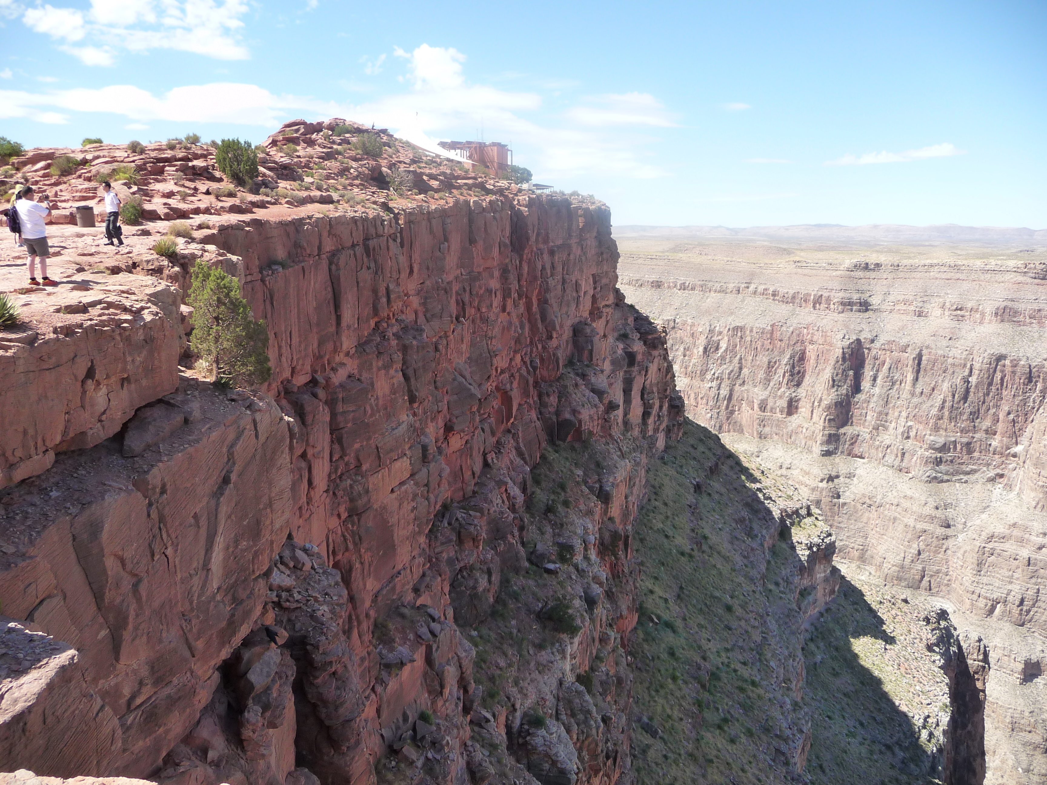 La structure que vous voyez derrière nous est le fameux Skywalk. Cette passerelle en forme de fer à cheval et au plancher de verre dépasse de plus de 20 mètres du bord, à une hauteur de plus de 1.200 mètres. Et pourtant, croyez le ou non, la sensation quand on est dessus n’est pas celle d’être aspiré dans le vide. Mais alors pas du tout. Le Skydeck de Chicago a plus soulevé mon cœur que cette passerelle… En fait, le truc c’est que même si on est au dessus du vide, le vide n’est pas plongeant à 1.200 mètres. Il a des rochers de partout, ce qui produit visuellement une sorte d’effet « escaliers ».