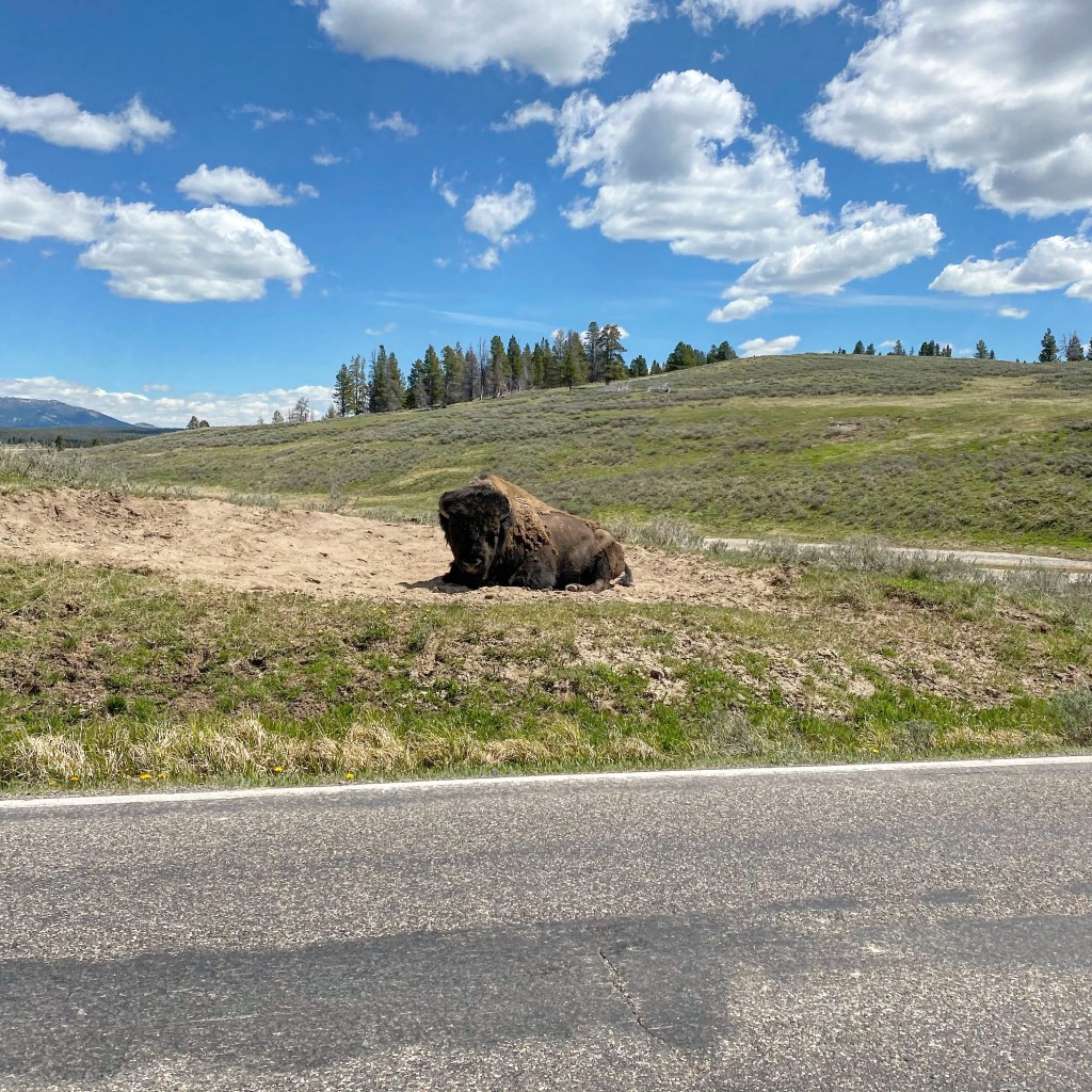 Bon ben là, à part attendre, hein… Voilà !! 20 minutes environ, on a eu de la chance, car la veille, en se rendant à l’hôtel, il y avait environ 15km de bouchons liés à un troupeau de bisons. Je pense au minimum 1h30 d’attente, des rangers sur place, ect… heureusement pour nous, on était du bon côté de la route mais on avait de la compassion pour ces pauvres automobilistes ! Toute façon, tu vas pas descendre de la voiture pour leur expliquer que t’es debout depuis 5h du mat’ et que tu voudrais arriver à l’ouverture du check-in de l’hôtel pour profiter un peu de la piscine…😅 Les bisons, ils s’en cognent !!