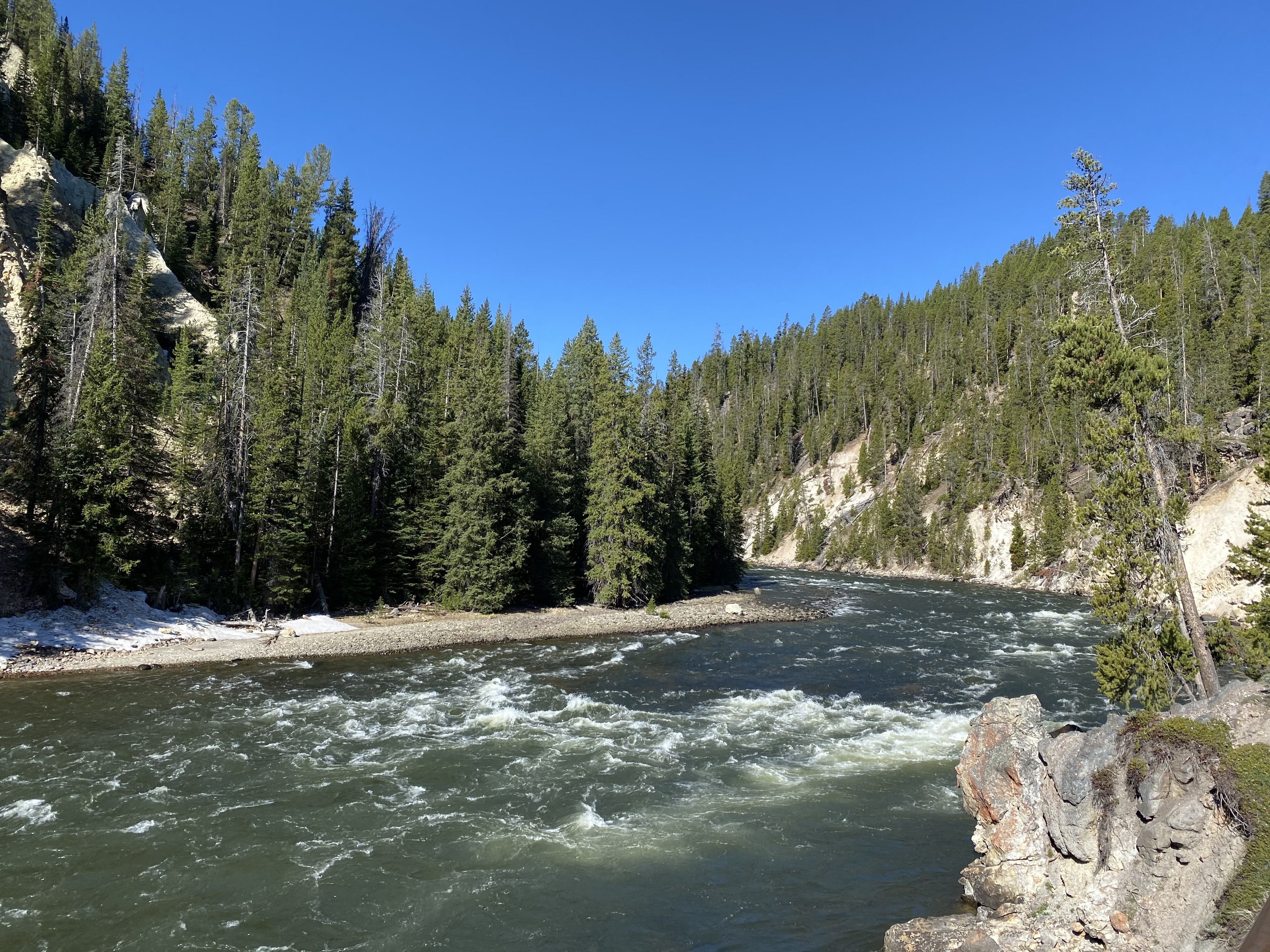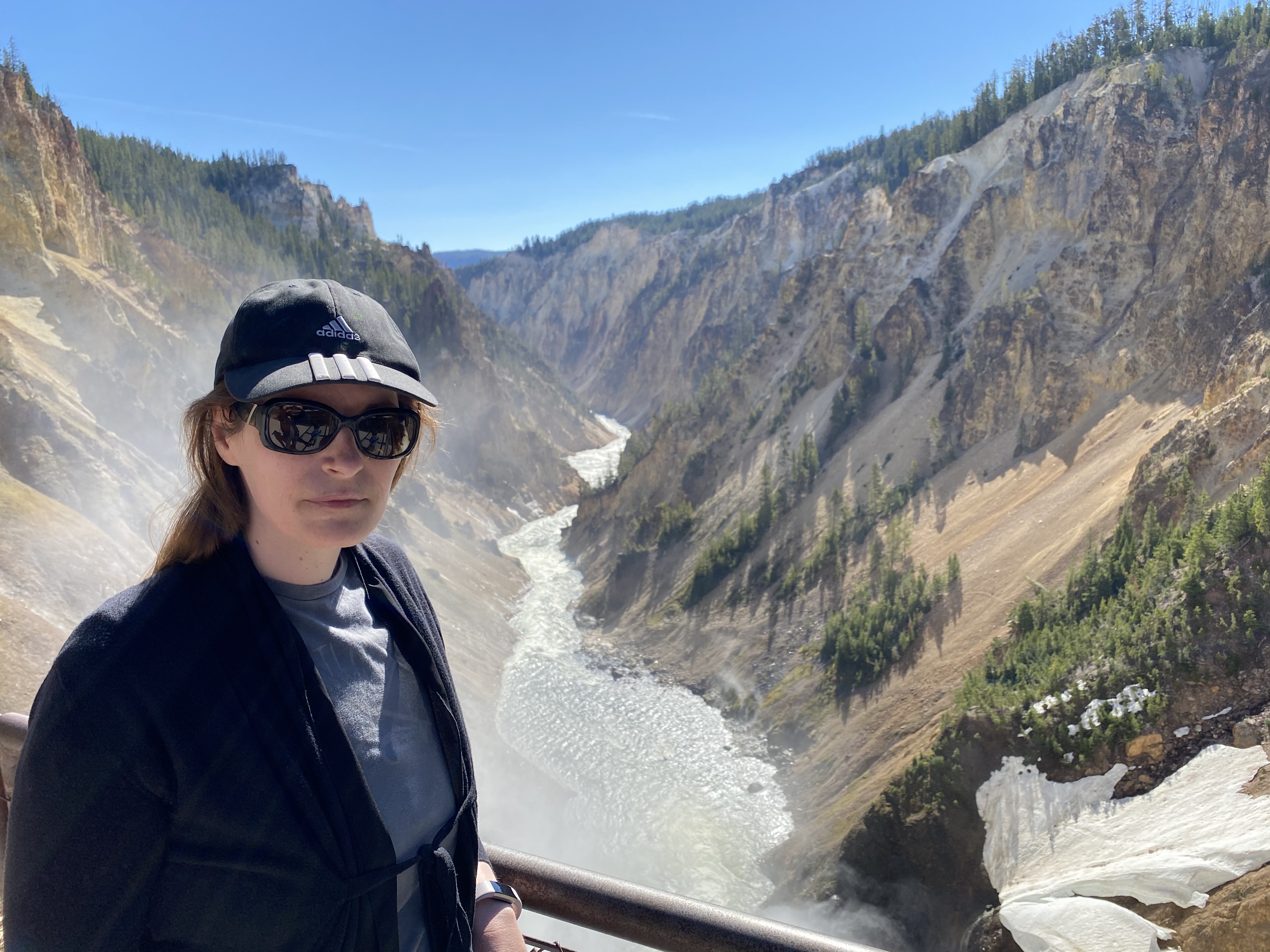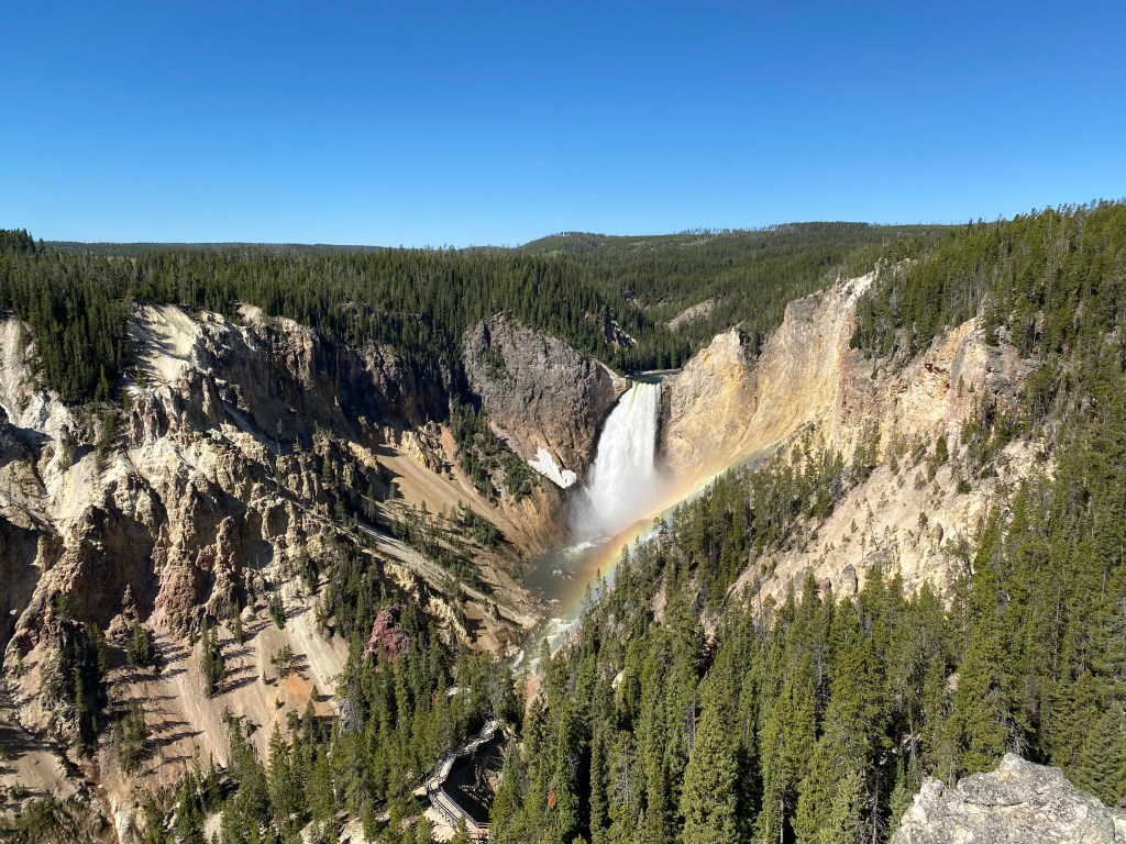 C’est de la roche jaune de ce canyon que le site tient son nom 🙂 On a fait la rive Nord, en commençant par la randonnée « Brink of Lower Falls », qui mène à l’endroit où l’eau de la Yellowstone River se jette dans le vide et forme donc ces chutes d’eau de 94 mètres, bien plus hautes que les chutes du Niagara !