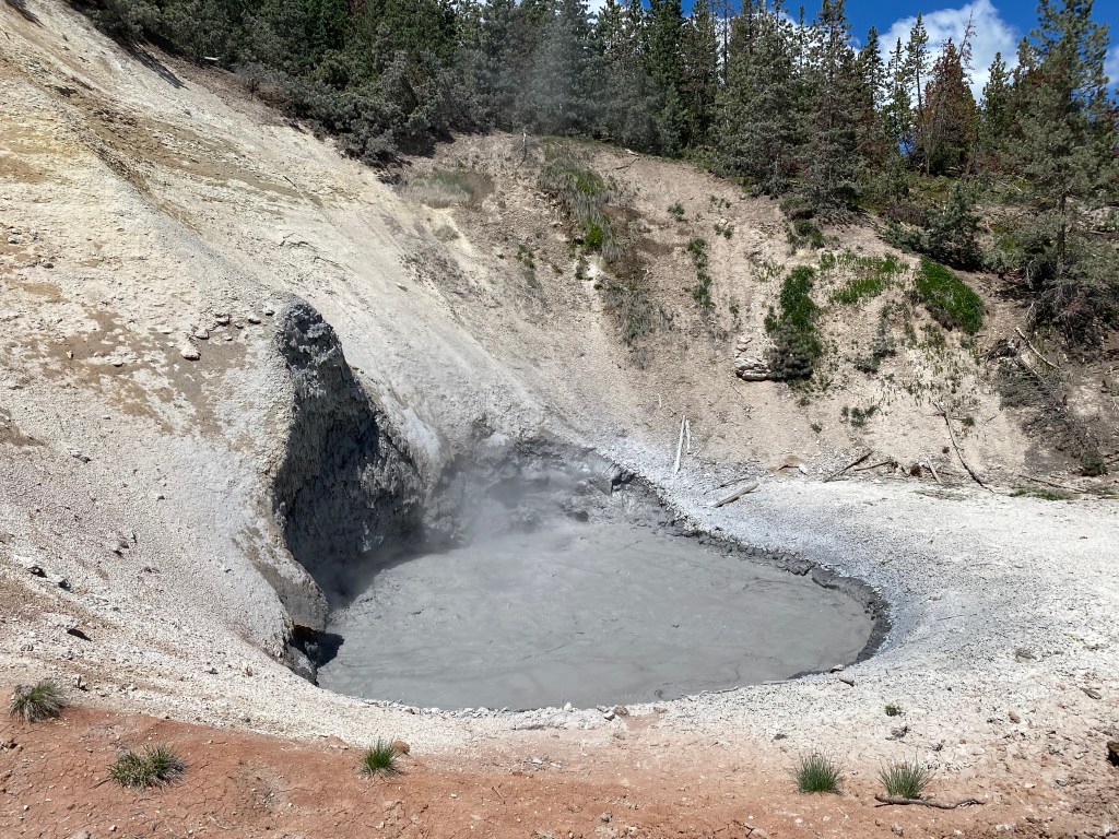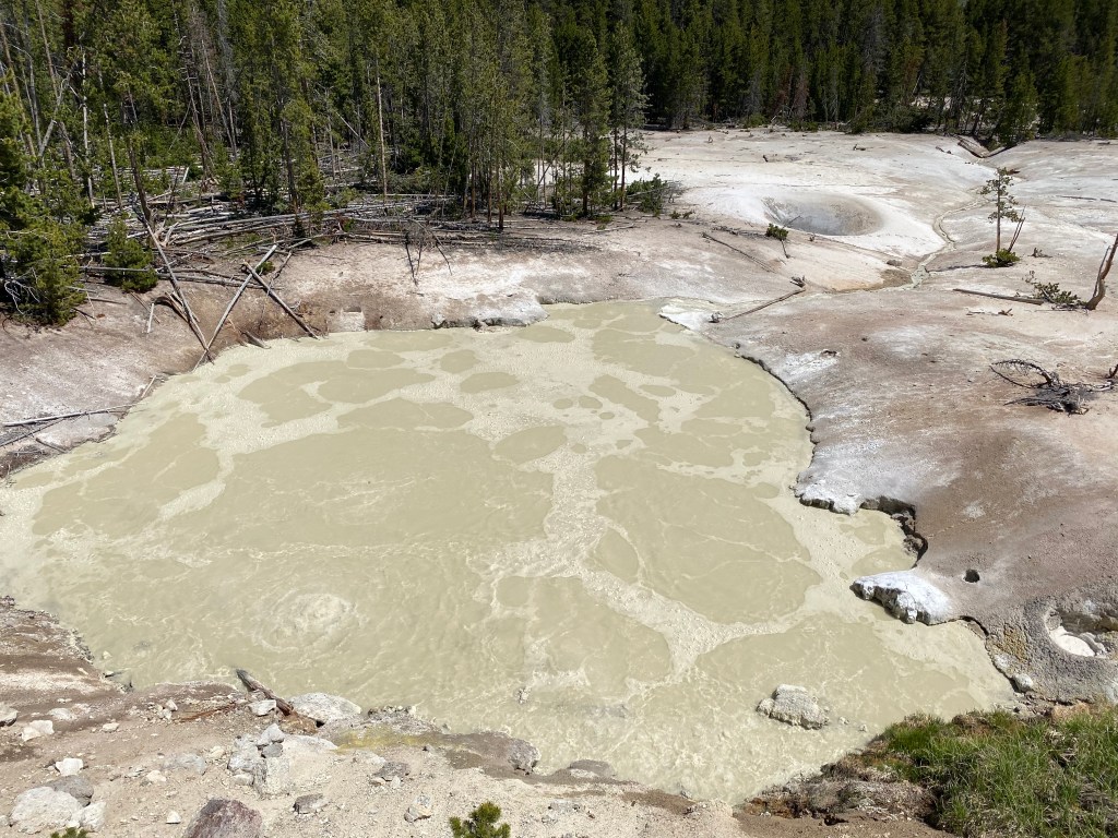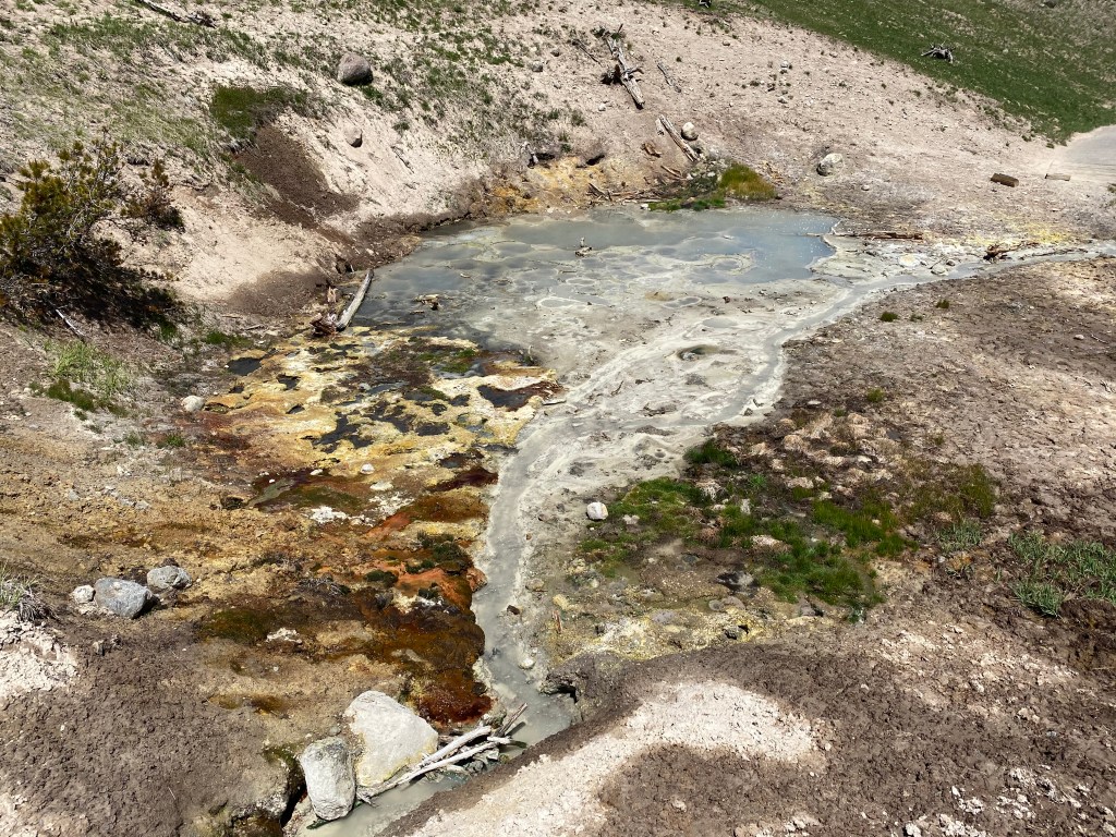 Le plus grand groupe de Mudpots (marres de boue) de Yellowstone ! L’odeur de soufre (d’œufs pourris quoi !!) est très présente mais c’est comme quand on rentre dans une parfumerie : les 2 premières minutes ça peut être inconfortable mais après on est habitué, on ne sent plus rien 😊