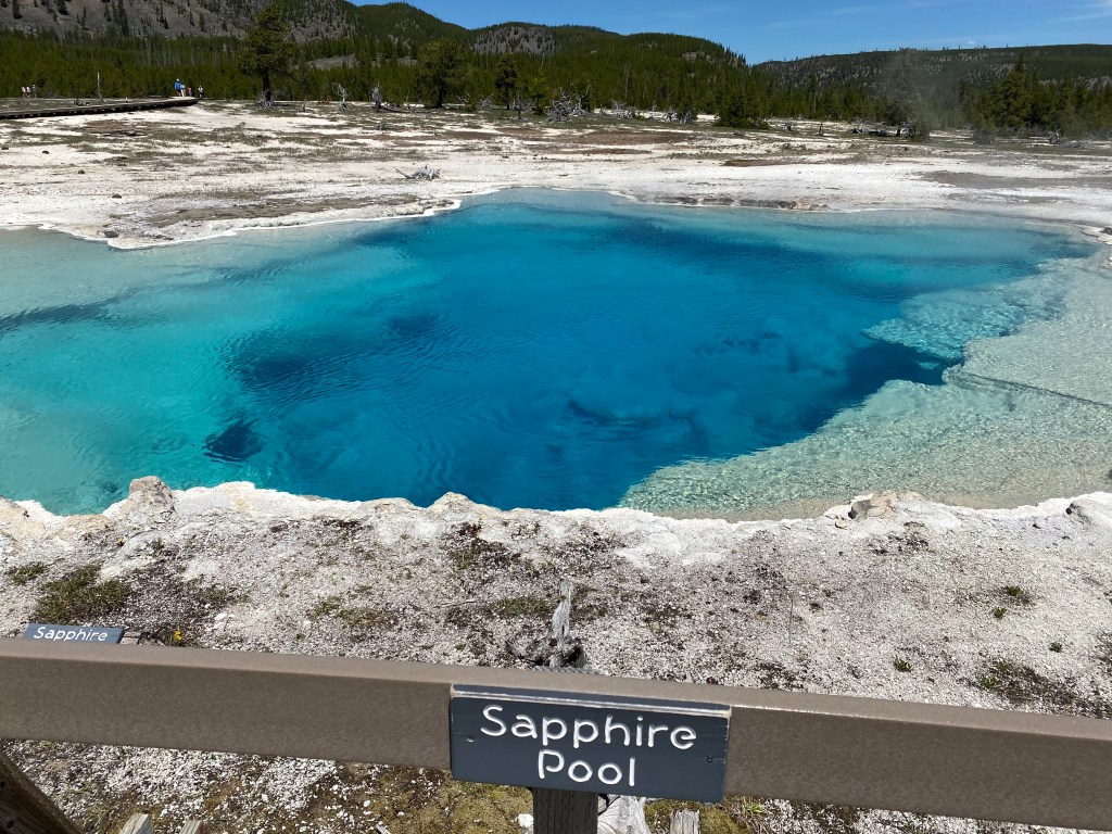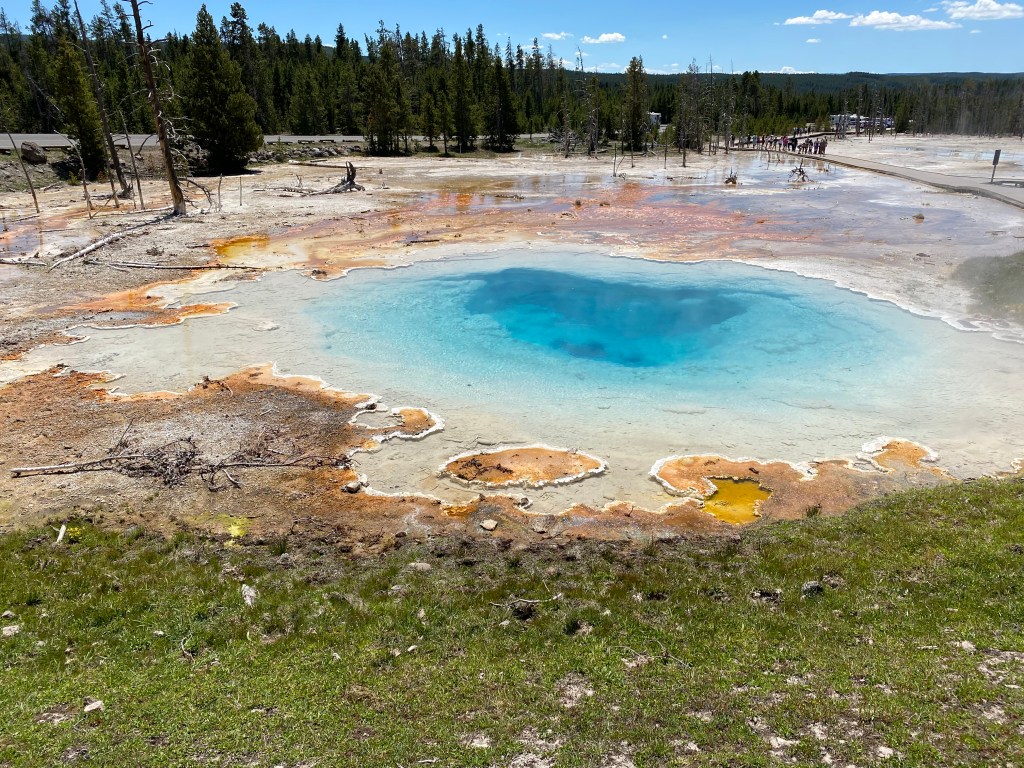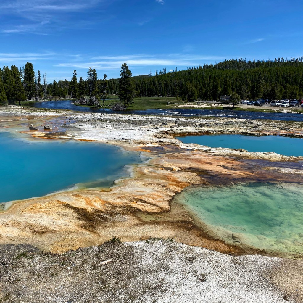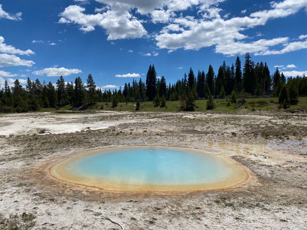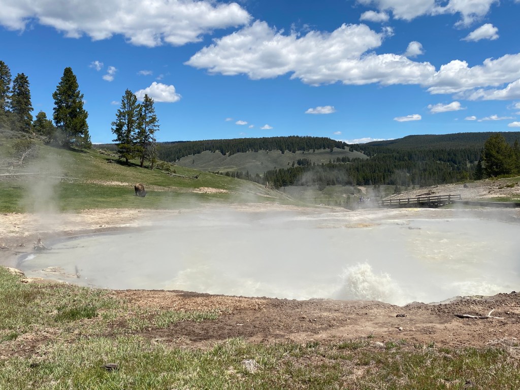 J’ai adoré ce bassin 😍 Tout y était : de belles sources chaudes, un bison qui broutait tranquillement à côté (toujours sympa à voir), une zone de fort vent ce qui est super agréable quand il fait une chaleur de tous les diables… ! Il y avait d’ailleurs des panneaux : attention à vos chapeaux ! Cerise sur le gâteau, j’ai assisté à l’éruption de 2 geysers : un à l’entrée du parking, je l’ai vu dans mon rétro 😎 et le second sur le bassin lui-même. Apparemment il est en éruption plusieurs fois par heure. Ils étaient petits mais comme c’était inattendu, c’était cool !