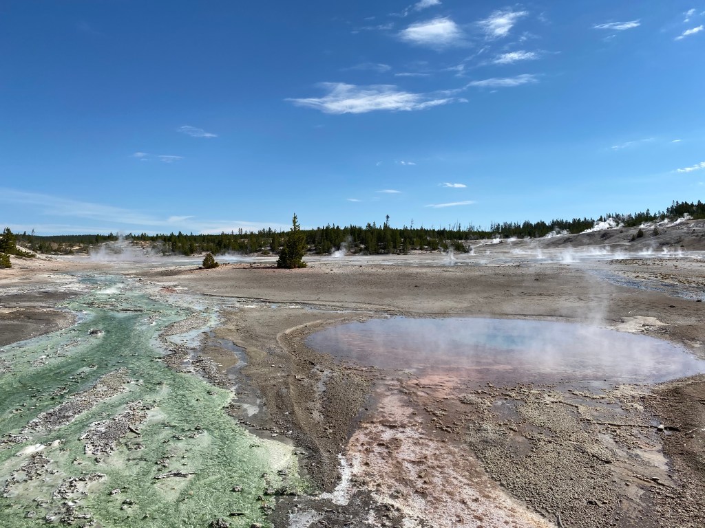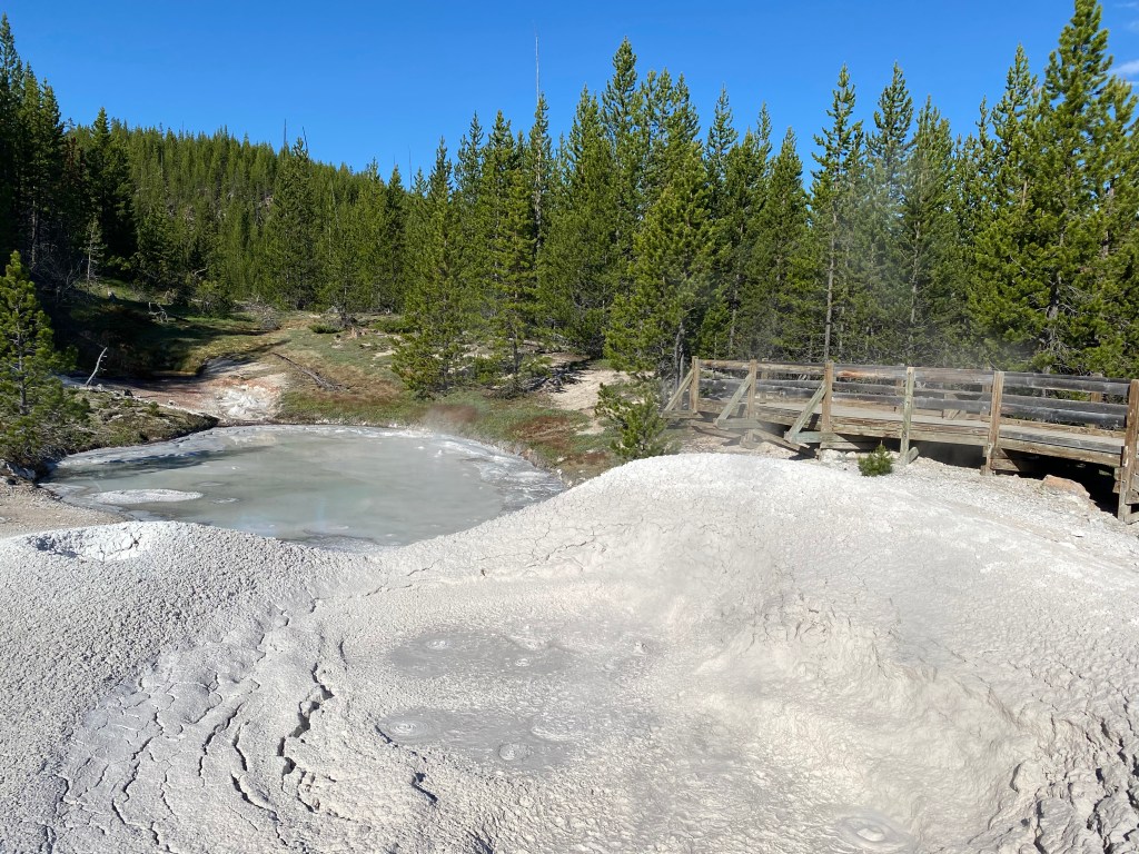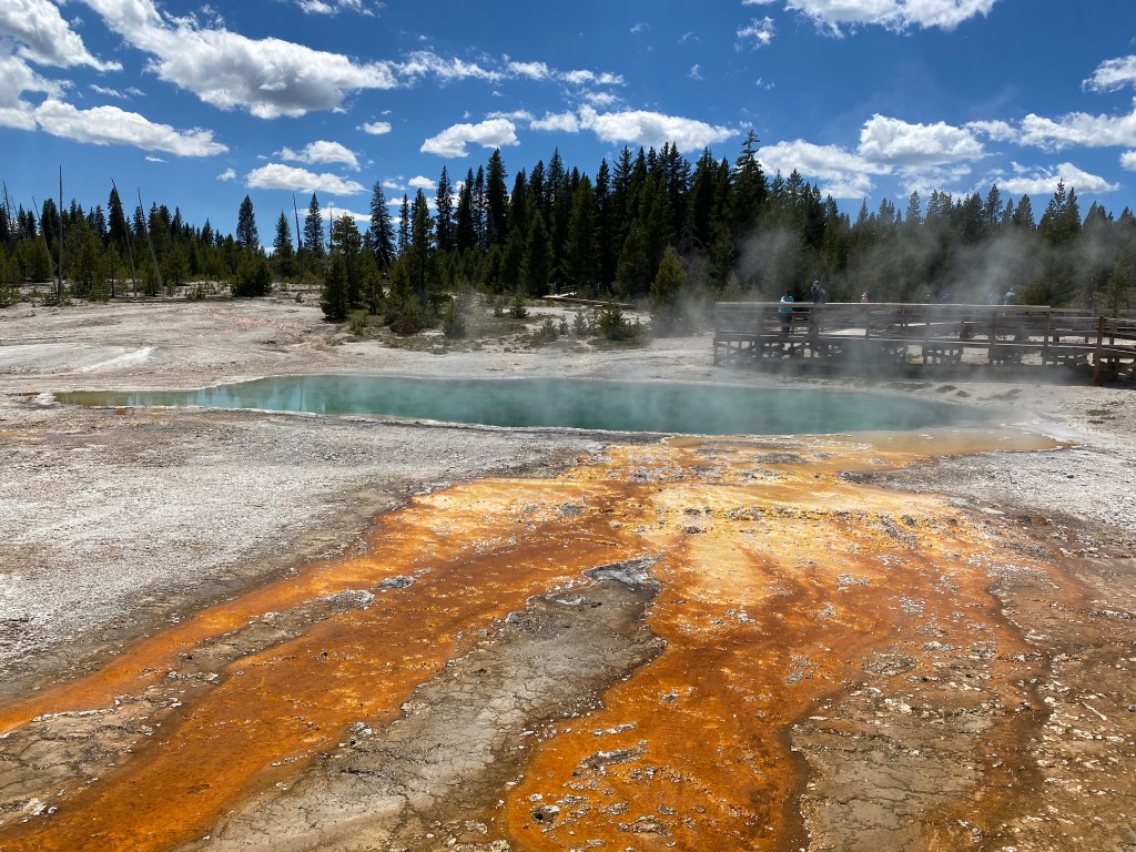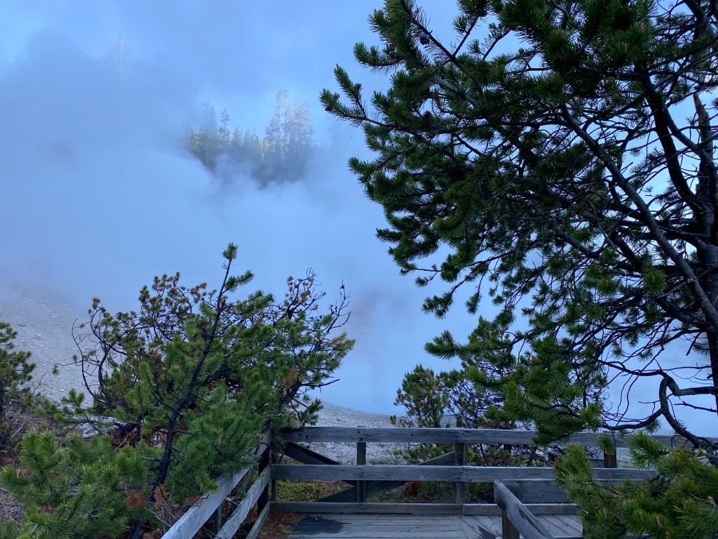 A voir la vapeur qui sort de partout à Yellowstone, on a souvent l’impression que la forêt est en feu, c’est un paysage bien étrange. Mais là, au petit matin, à Beryl spring, cette sensation était à son apogée. C’est parfois à peine si on voyait quelque chose en marchant sur la petite passerelle. Incroyable ! Nous sommes repassés devant un peu plus tard (j’avais pas tourné dans le bon sens en sortant du bassin suivant 🤦♀️) et on l’a donc revu avec bcp moins de fumée, moins impressionnant… Tout l’inverse de Grand Prismatic donc, le matin c’est le mieux !