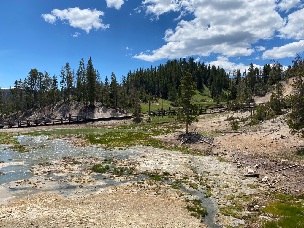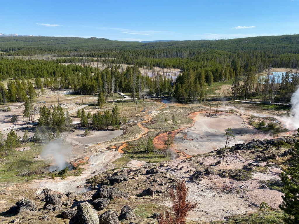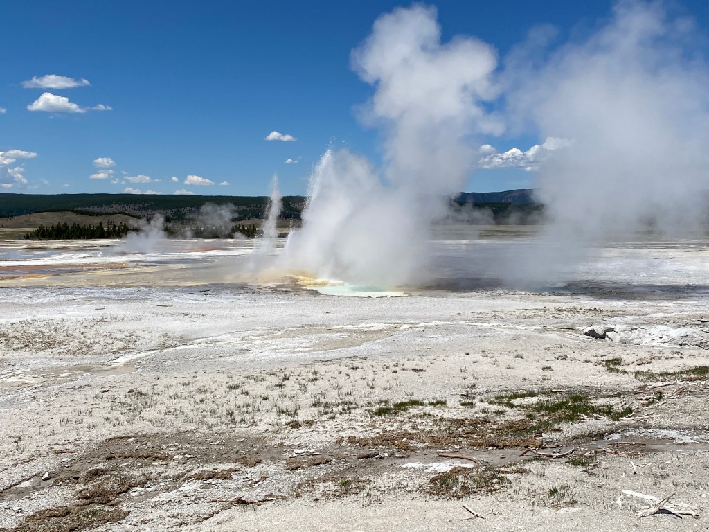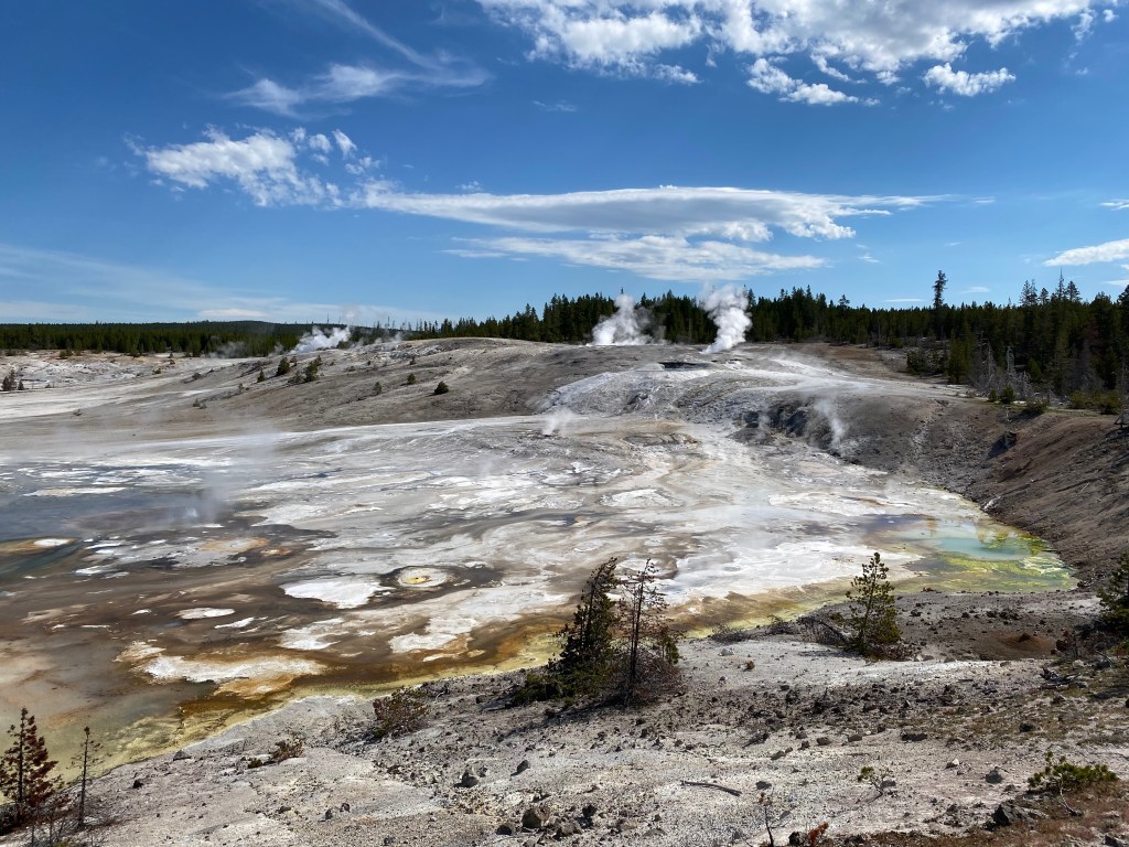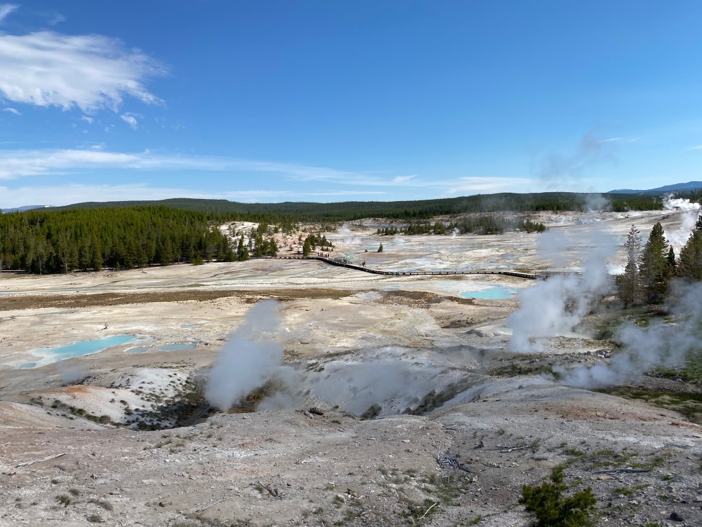 A voir la vapeur qui sort de partout à Yellowstone, on a souvent l’impression que la forêt est en feu, c’est un paysage bien étrange. Mais là, au petit matin, à Beryl spring, cette sensation était à son apogée. C’est parfois à peine si on voyait quelque chose en marchant sur la petite passerelle. Incroyable ! Nous sommes repassés devant un peu plus tard (j’avais pas tourné dans le bon sens en sortant du bassin suivant 🤦♀️) et on l’a donc revu avec bcp moins de fumée, moins impressionnant… Tout l’inverse de Grand Prismatic donc, le matin c’est le mieux !