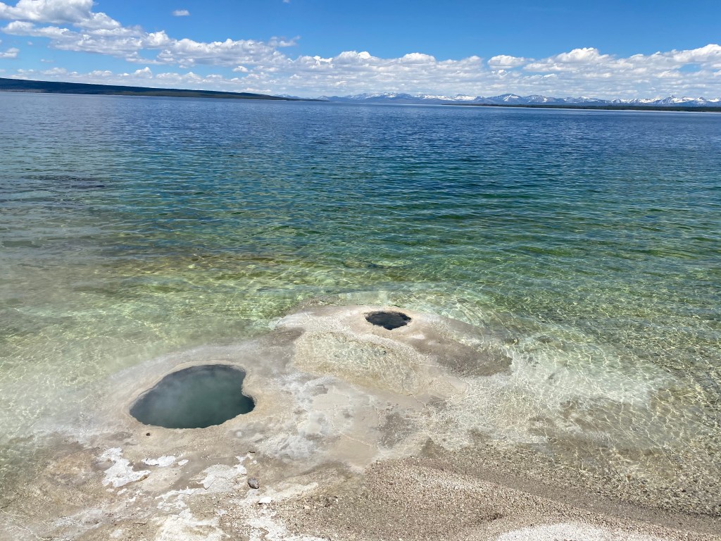 C’est ici qu’a eu lieu la dernière éruption volcanique, il y a 170.000 ans. Ce qui est super avec ce bassin, c’est qu’il est à côté du Lac de Yellowstone, plus grand lac de haute altitude d’Amérique du Nord. Et le contraste entre les sources chaudes, le lac et les montagnes enneigées en toile de fond est vraiment détonant !
