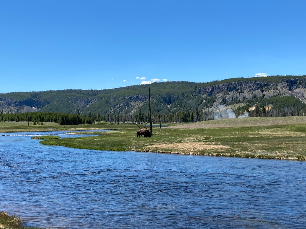 Ce qui est fantastique avec ce Parc, c’est qu’on peut y aller pour voir les curiosités hydrothermales, mais aussi pour profiter de la faune sauvage. En effet, Yellowstone est l’habitat d’une centaine de loups, des renards, des coyotes, des wapitis, des mouflons, des cougars, des lynx, des élans, plus de 1.300 ours (noirs et grizzlis confondus), ect… mais aussi et surtout du plus ancien et du plus grand troupeau de bisons des États-Unis, 4.000 têtes à ce jour. Vous ne pouvez pas les louper, il y en a PAR-TOUT ! 🦬🦬🦬