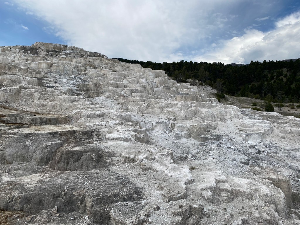 Partout on voit des sources chaudes, des marres de boue qui bullent, des geysers et des fumeroles. Mais il n’y a qu’ici qu’on voit la 5ème curiosité hydrothermale : les terrasses en traversin. La déambulation sur les passerelles peut être rude en après-midi. Il y a beaucoup beaucoup de marches et évidemment pas un centimètre d’ombre. Nous n’avons pas spécialement accroché avec cette partie du Parc.