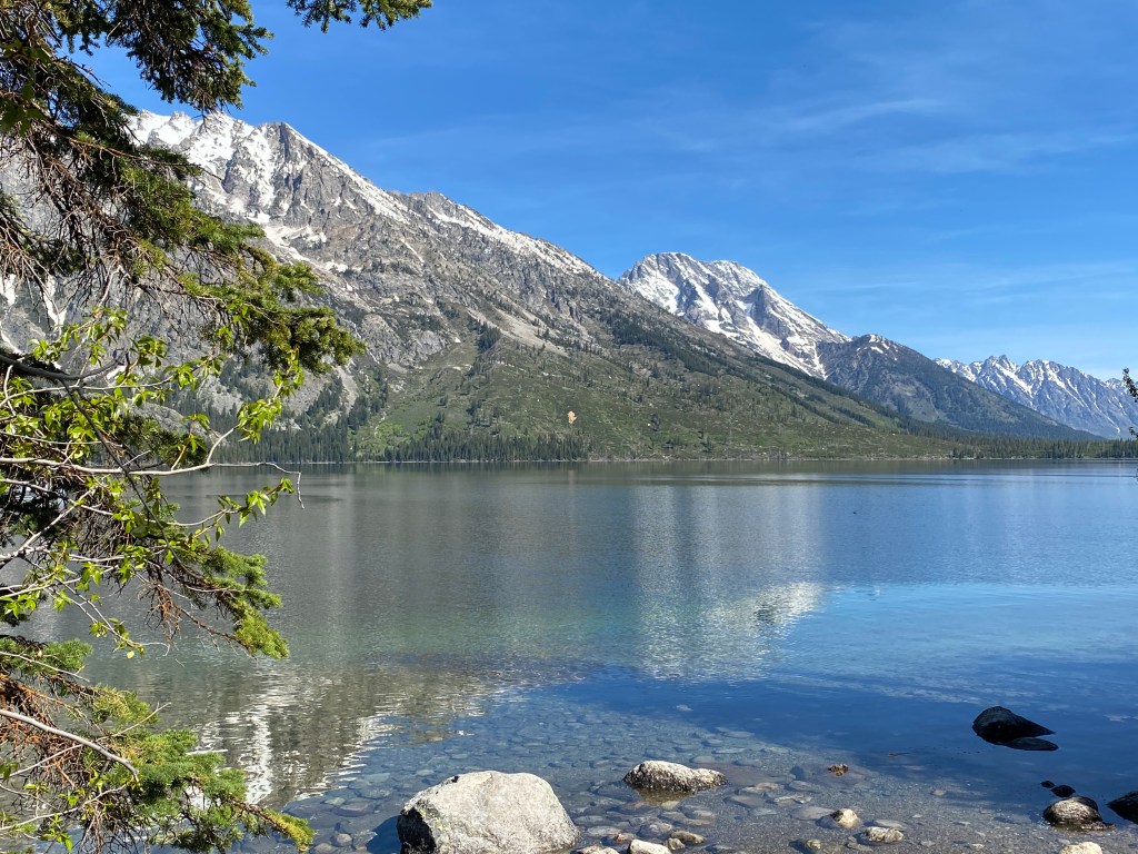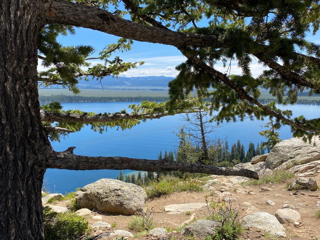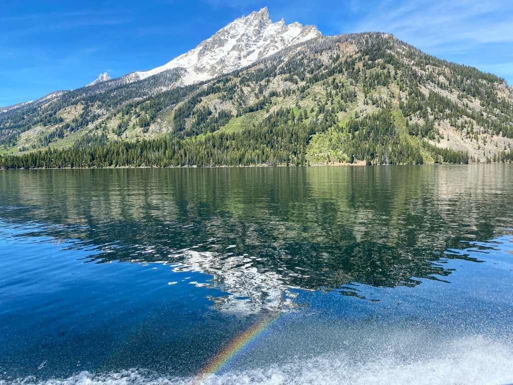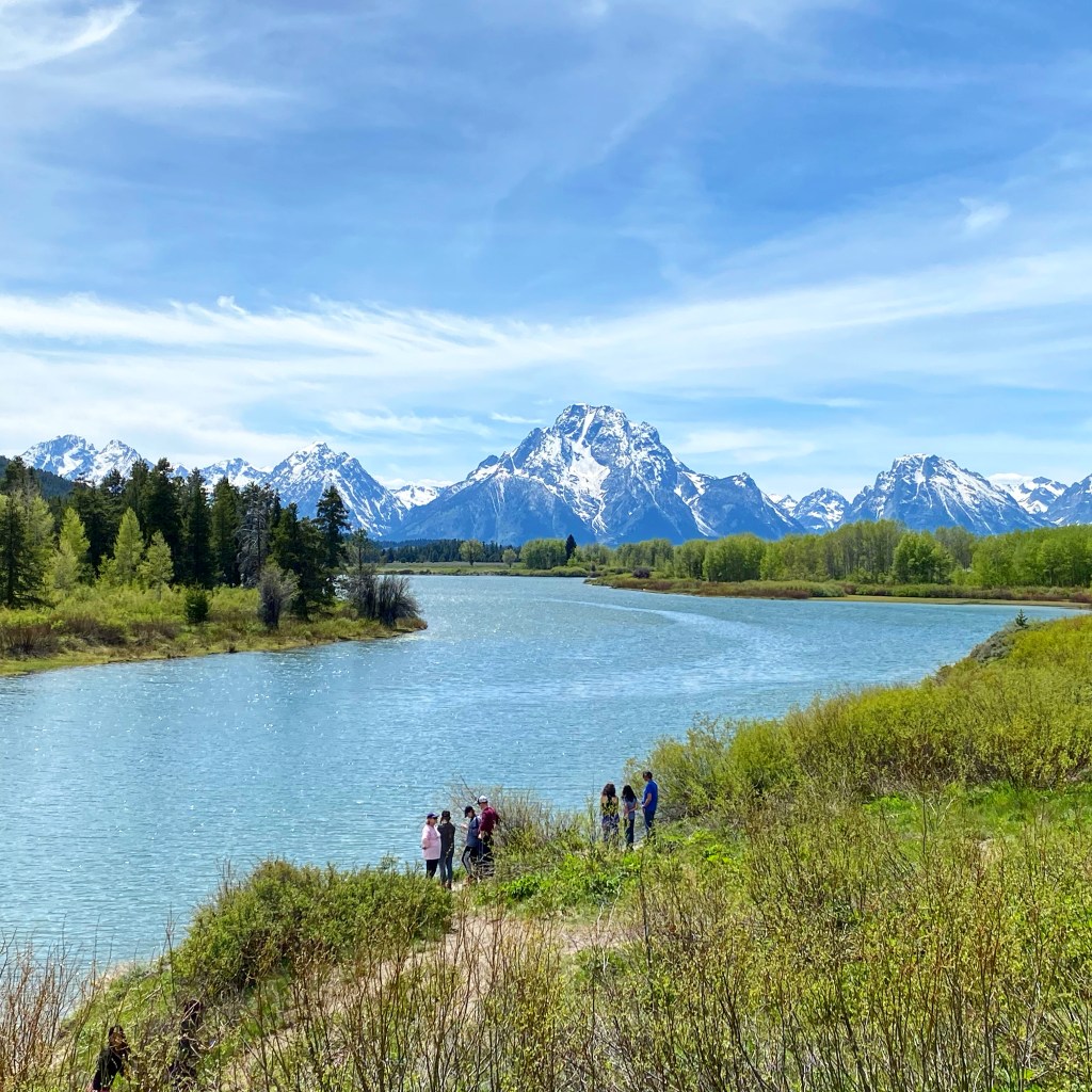 Comme toujours avec le petit, chaque pas compte donc on a décidé pour s’économiser de prendre le bateau navette qui nous emmène de l’autre côté du lac. Ca faisait passer la rando à 4km. Pas de résa possible, départ toutes les 15min à East Boat Dock. On a dû attendre le bateau plus d’une heure aller, encore plus longtemps au retour, et sous un soleil de plomb. Au final juste cette rando nous aura pris presque la journée entre la route pour entrer dans le parc, se rendre à Jenny Lake, trouver une place de parking, aller sur le dock, attendre le bateau ect ect ect…… Mais on quand même pris le temps de s’arrêter à Oxbow Bend en suivant, sublime.