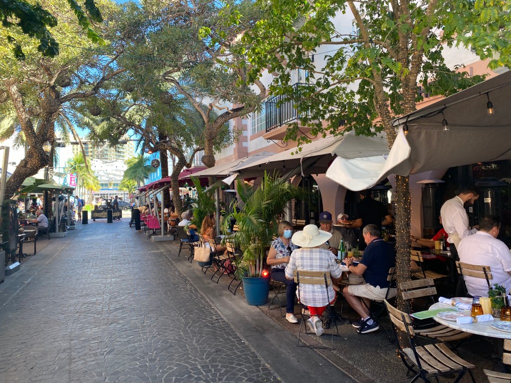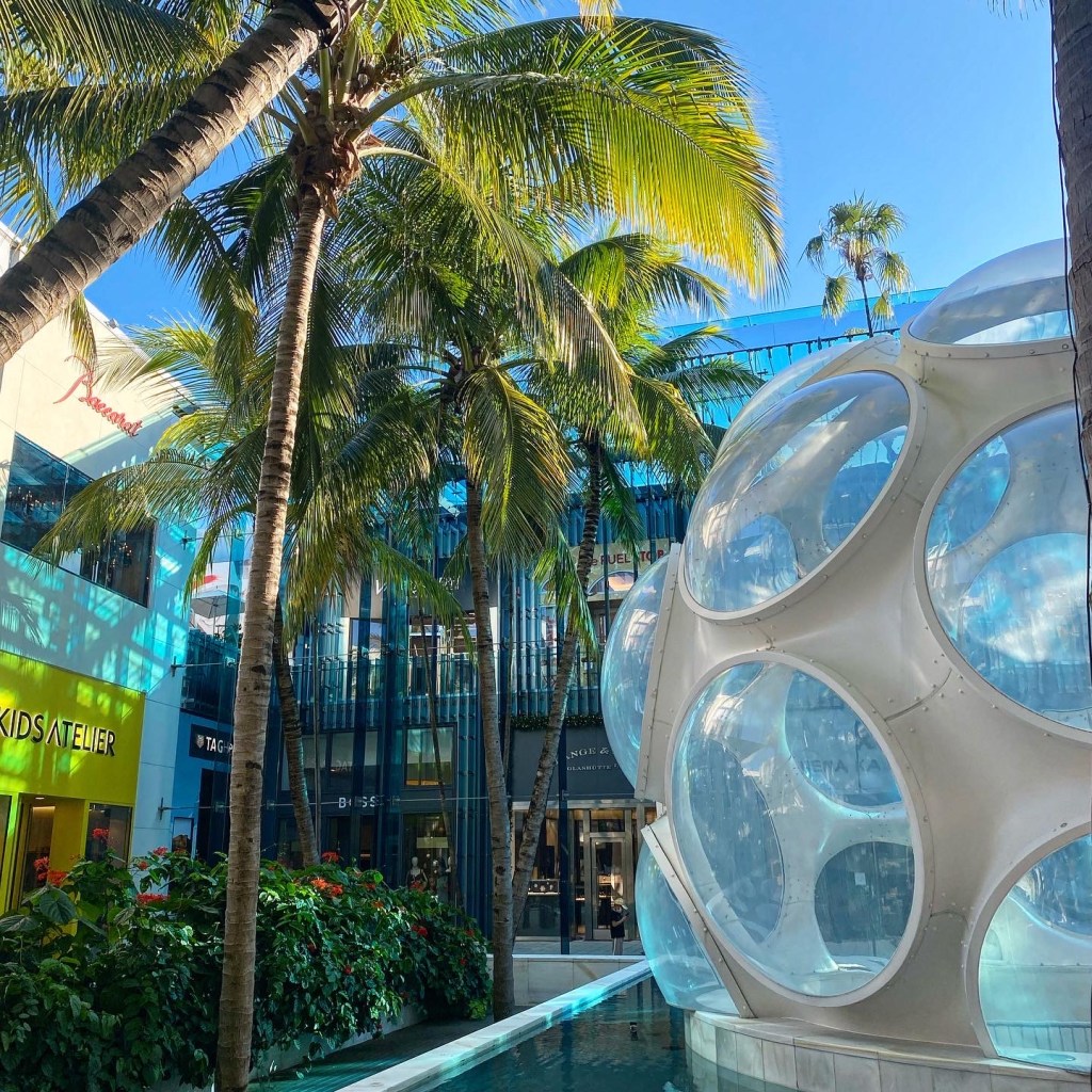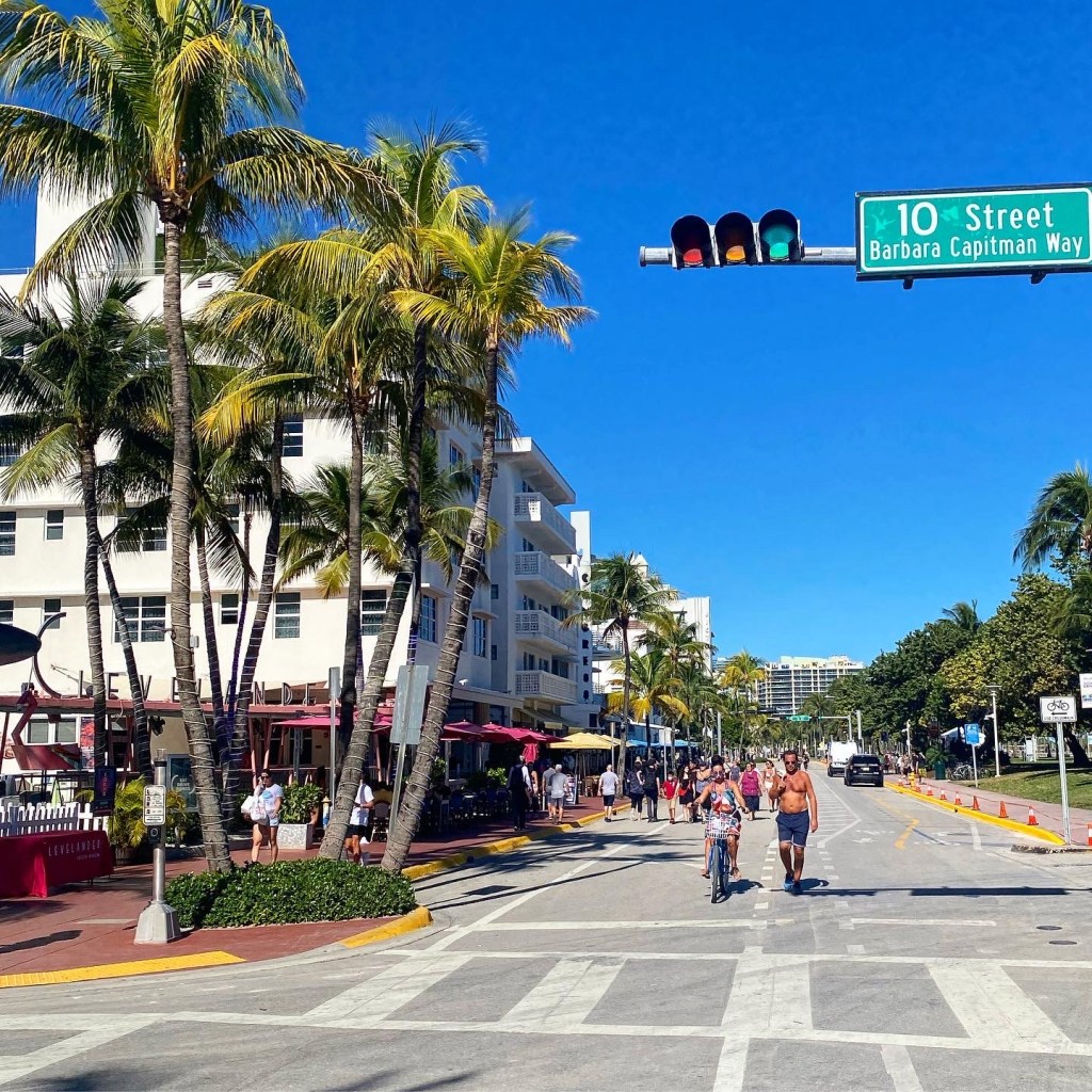 Miami est une ville bling bling et cette partie de la ville en est son paroxysme. Ce n’est pas forcément péjoratif, ça peut aussi être amusant. La rue était fermée à la circulation, l’occasion pour un monsieur m’as-tu-vu farfelu de déambuler encore et encore en roller avec une tenue improbable et son speaker tendu à bout de bras avec la musique à fonds… 🎶 Un groupe de 3 filles tentaient d’apprendre à en faire justement mais ce n’était pas un grand succès ! Des allers-retours de personnes excentriques aux tenus flashy. De la musique plein pot sortant des devantures de restos. Bâtiments style art déco. Vous vous imprégnez de l’ambiance rapidement et pouvez passer un long moment à observer ce tableau pittoresque.