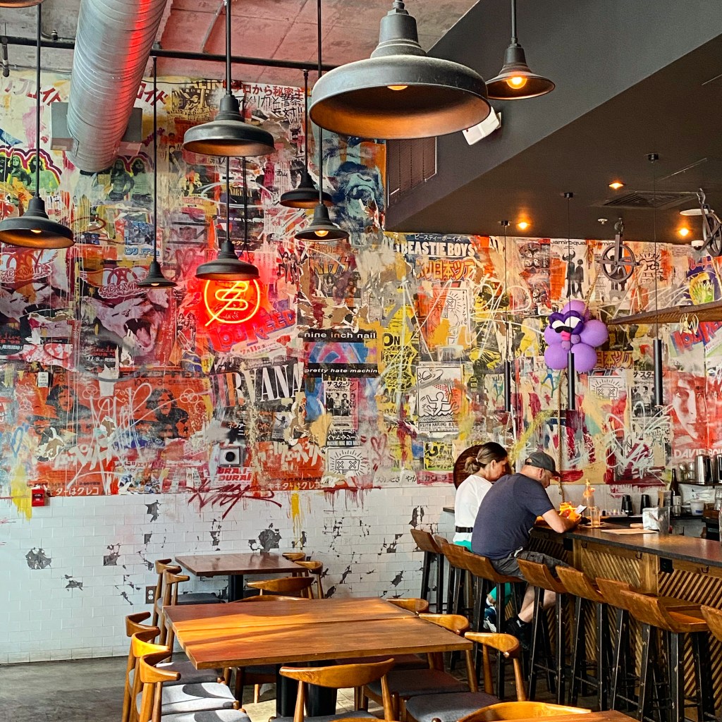 On a fini par déjeuner dans un truc de bobo, avec des noms improbables sur la carte. J’ai commandé une bière komboucha ou un truc du genre et un verre transparent est arrivé. En fait c’était comme une « root beer »… sans alcool… 🙃 Mais moi les gars ça m’agace de voir des bières qui sont pas des bières dans la colonne « beer » sur les cartes… !! Voilà pour le petit coup de gueule !! Du coup, j’ai rappelé la serveuse et j’ai pris une bonne vieille Stella Artois en remplacement. Elle a été sympa, elle m’a pas fait payé le machin blanc 😉