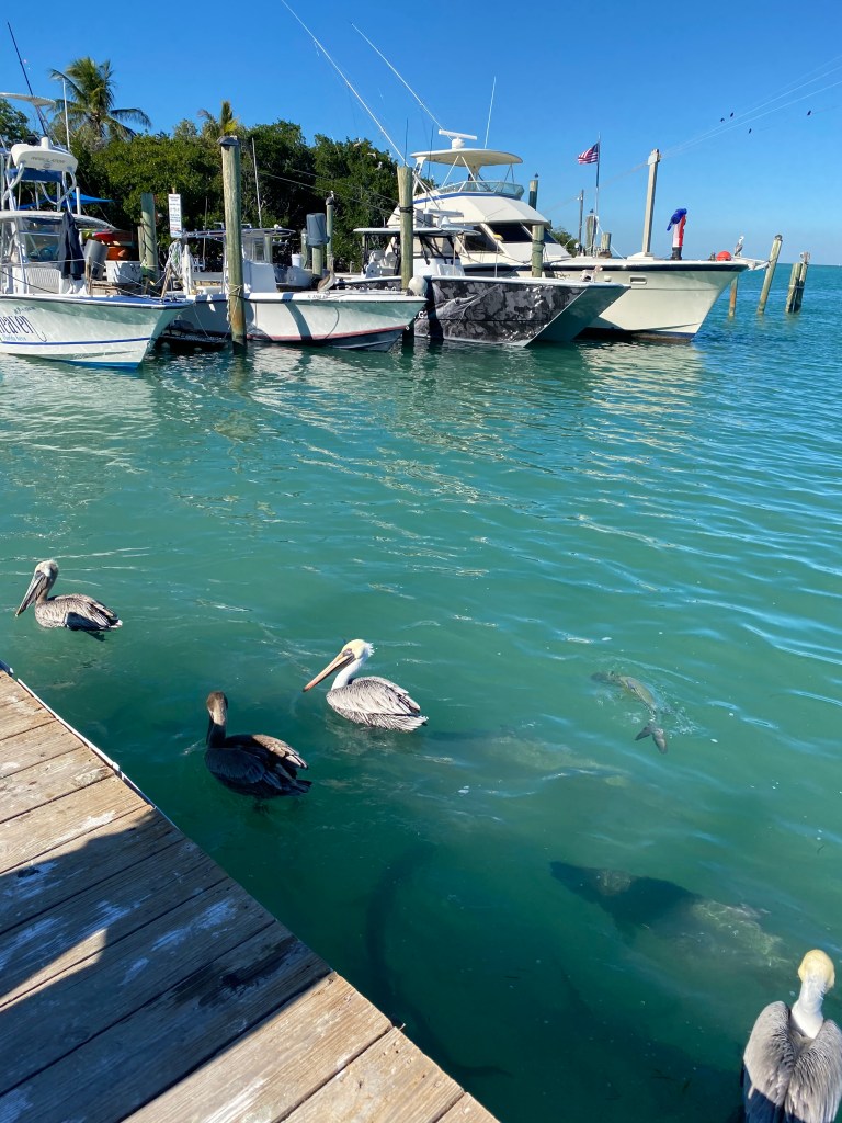 Cette marina nous a séduite 💖 Les gens s’arrêtent pour manger un bout, boire une bière, profiter du coin ou pratiquer quelques activités dont une que nous voulions absolument essayer : nourrir les tarpons. Cette activité peut porter à controverse mais les tarpons ne sont pas enfermés, ils choisissent de venir à la marina (oui, parce qu’ils savent qu’ils seront nourris, je sais… Ca se discute !). Le seau de poissons n’est pas cher, un ou deux ça suffit pour en prendre plein les yeux… et les oreilles !!