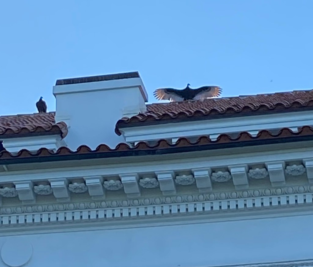 Bien que n’ayons pas vu d’anhinga pendant l’Anhinga trail dans les Everglades, on a pu en voir sur le toit de la bâtisse. Comment le reconnaitre de si loin ? Tout comme les cormorans, ils ouvrent leurs ailes pour les sécher.