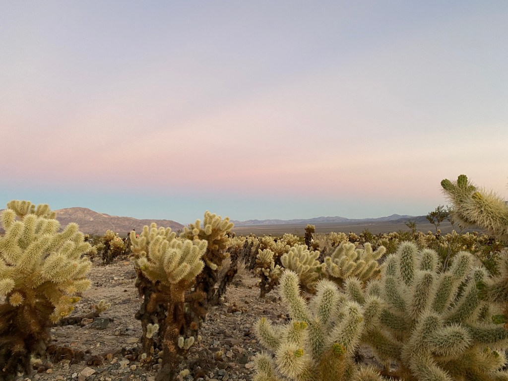 Entre Cholla et la sortie Sud du parc, il a plusieurs parkings, on en a choisi un pour s’installer et attendre… Entre le moment où le soleil se couche et le moment où il fait vraiment nuit noire pour observer les étoiles, c’est long. Très long ! J’avais acheté une lumière rouge pour que l’œil s’habitue plus vite au noir et faciliter le stargazing mais au final c’est le balai des voitures qui entrent et sortent sur les parkings, donc y’a de la lumière blanche beaucoup plus souvent qu’on en voudrait (et qu’il en faudrait pour observer correctement). On repartira plutôt vite.