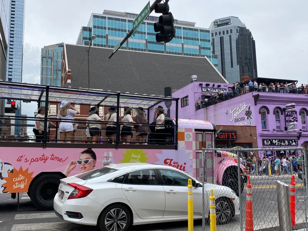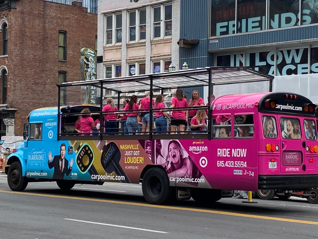 Et des filles, il y en a beaucoup car Nashville, et surtout Broadway, est connu pour accueillir les enterrements de vie de jeune fille. Et en effet, ça défile non stop ! Elles sont dans des party bus mais ouverts. Ce qui est marrant, c’est qu’on a croisé des bus dans les rues adjacentes, c’était plutôt calme, et dès que le bus arrive dans la rue principale, elles se lèvent et font les woo girls. Plus pour se montrer que pour la faire la fête donc. Mais bon, c’est folklorique !!
