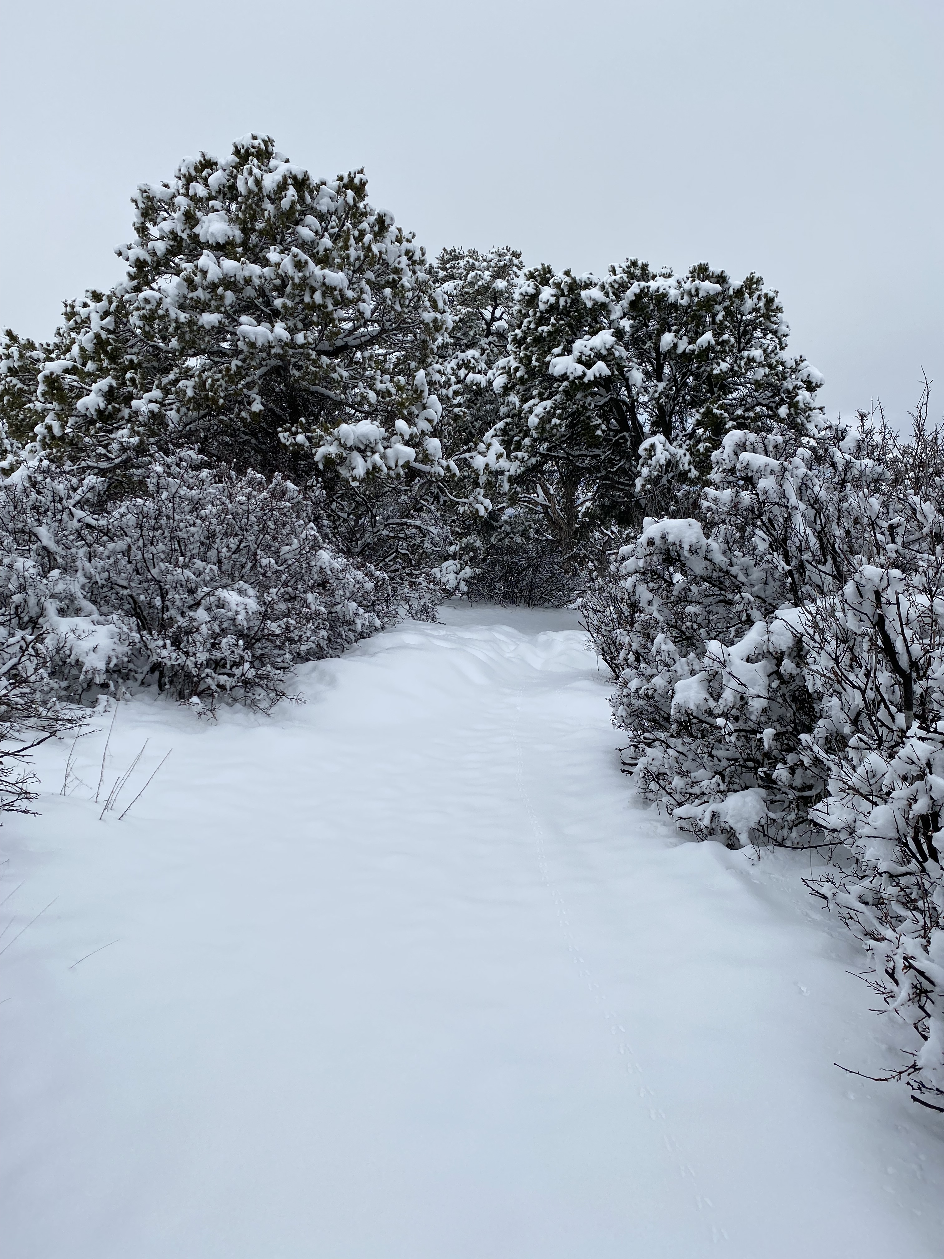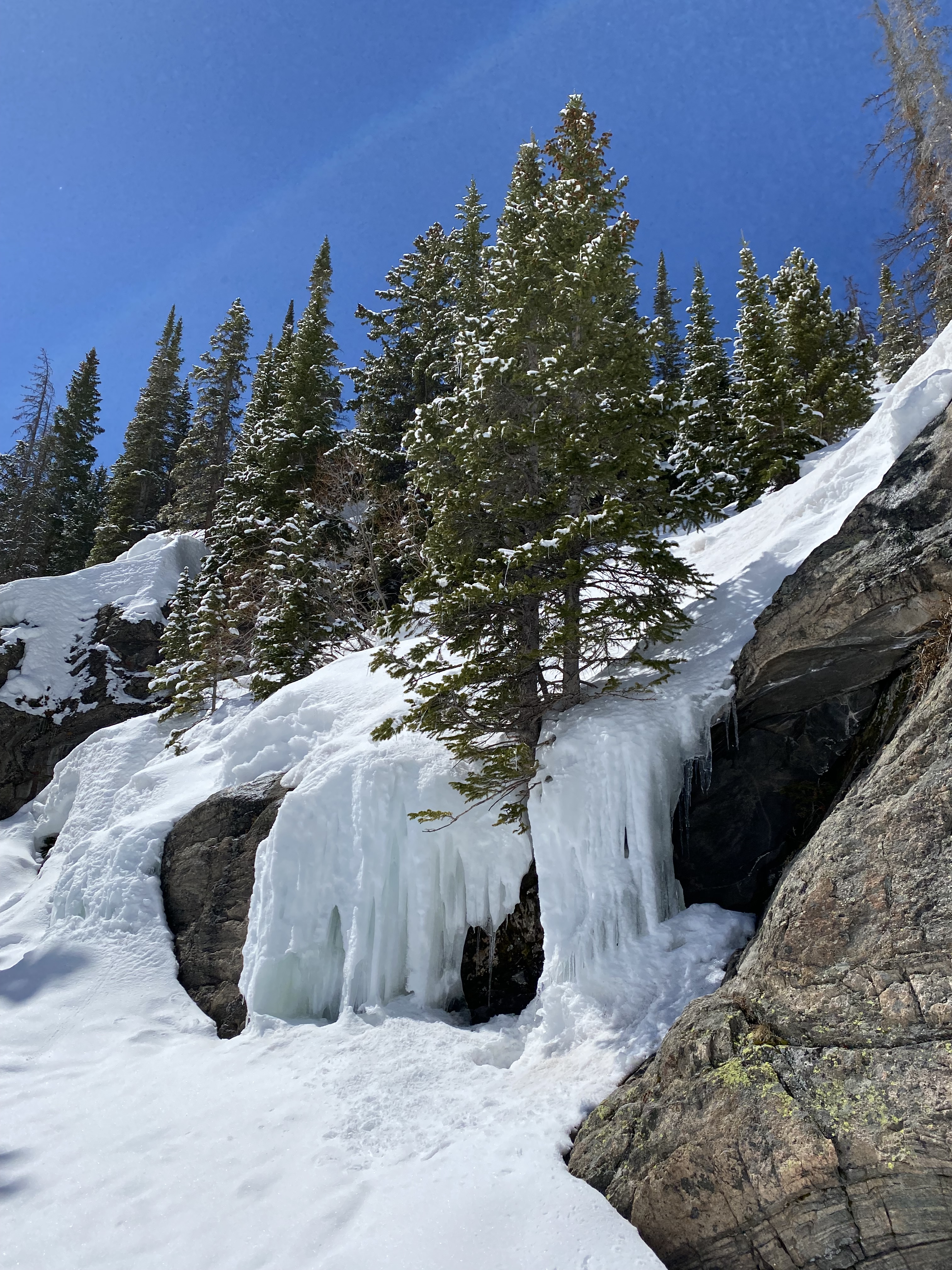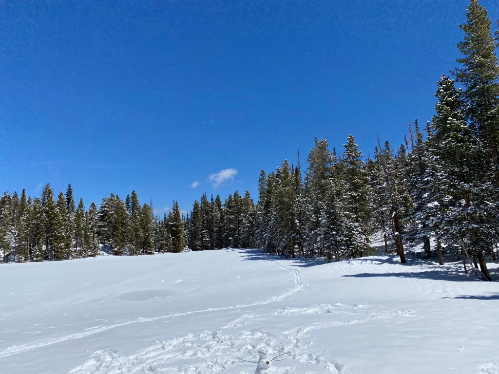 Le parc est presque désert. On fait la route scénique jusqu’au bout pour nous rendre au Warner View Trail, 2,5km. Ca parait peu mais c’est 130m de dénivelé à 2.500m d’altitude. Et nous sommes les tout premiers visiteurs à faire la rando depuis la tempête de neige. Tout est recouvert, on ne voit pas les rochers ou autres obstacles sur le chemin. On ne peut pas avancer très vite. Le point de vue final était beau mais honnêtement, j’ai pas trouvé le ratio – temps / effort / vue – spectaculaire vu les conditions… Une rando qui nous a donné du fils à retordre !