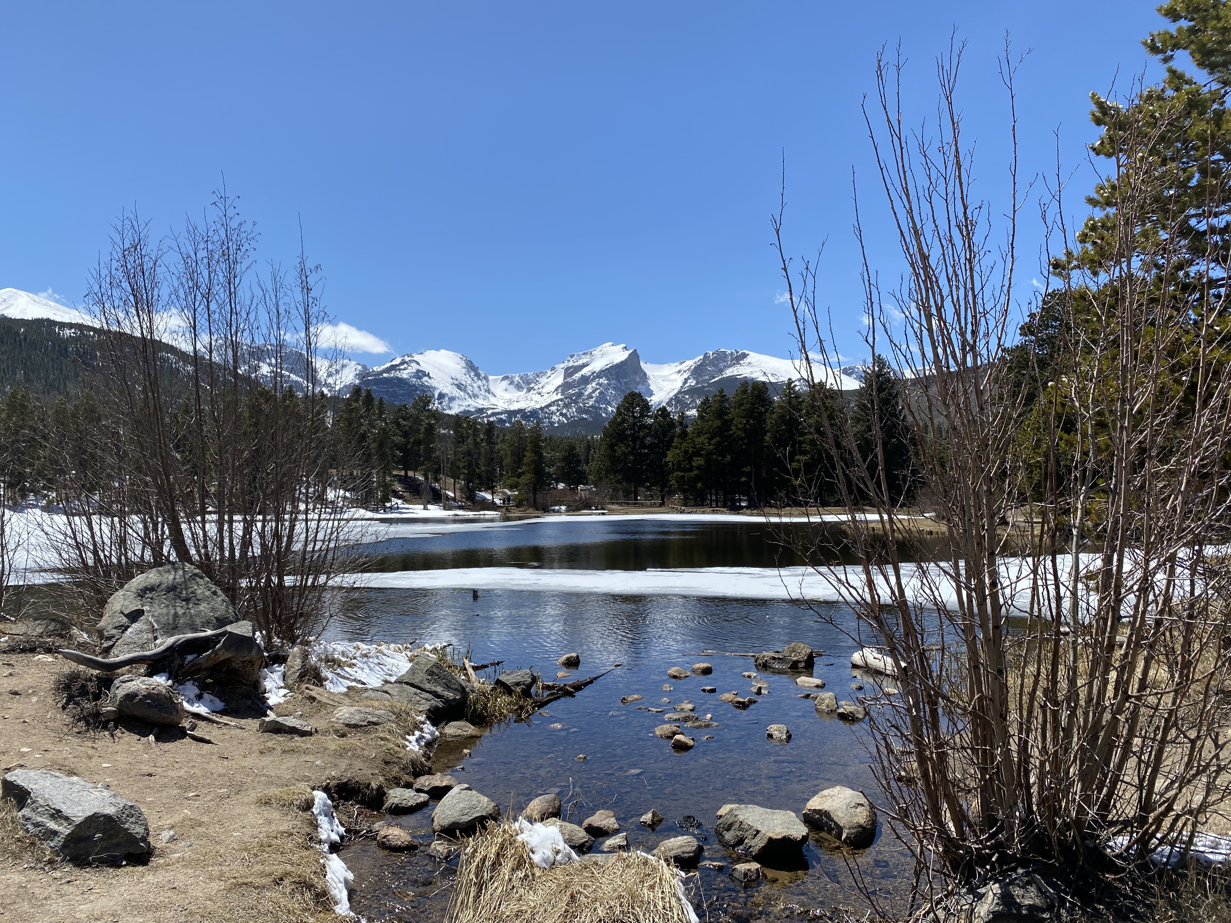 On fait une longue pause dans la voiture, on mange, on se pose, et on réfléchit. La randonnée suivante que j’avais prévue était dans une tout autre zone du parc et en plus basse altitude mais elle faisait plus de 5km, on sentait qu’avec le petit que ça n’allait pas le faire vu l’énergie qu’il avait dû déployer durant la matinée. En regardant le plan, je vois Sprague Lake, 800m de marche pour en faire le tour, à plat, et à « seulement » 2650m d’altitude, on se dit que c’est parfait. Et en effet, ça l’a été !