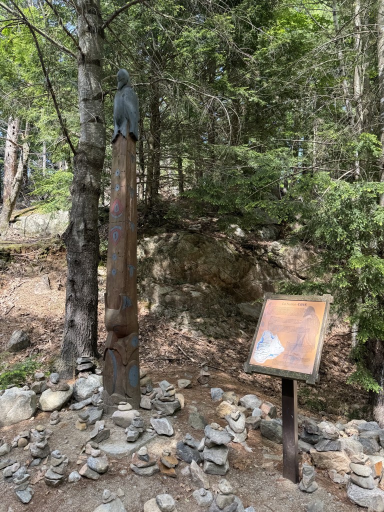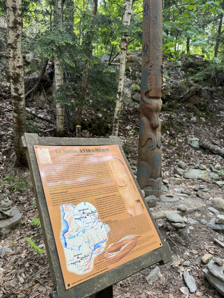 On a terminé dans la partie qu’ils appellent « la terre des premières nations ». Il y a un petit sentier autour d’un lac qu’on peut faire à pied avec des totems et des histoires sur, comme son nom l’indique, les premières nations qui vivaient au Québec. Un bel hommage aux natifs.